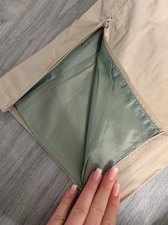 Pantalon cargo beige crème - Excellent état - Elastique à la taille (40 à 46cm) - Nombreuses poches - Zip au niveau des chevilles - Polyester et coton - Doublure intérieure - Modele unisexe - Indiqué Taille L - 40/42