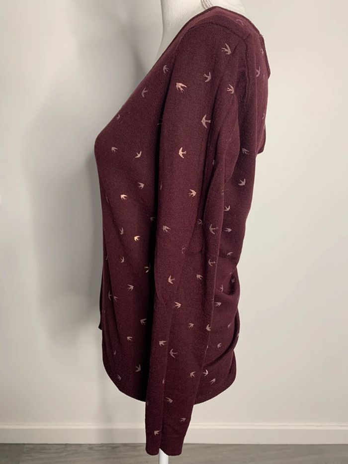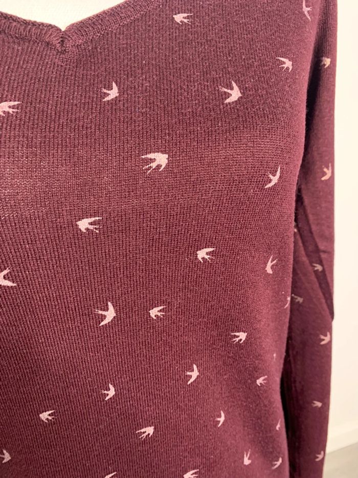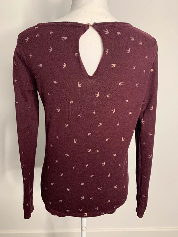 Pull bordeaux - Excellent état - Motifs hirondelles pailletées couleur bronze (quelques parties sont moins brillantes que d’autres) - Taille S équivalent 36 - Ouverture dans le dos - Manches longues - Pull fin mais plus chaud qu’un t-shirt à manches longues - Col en V