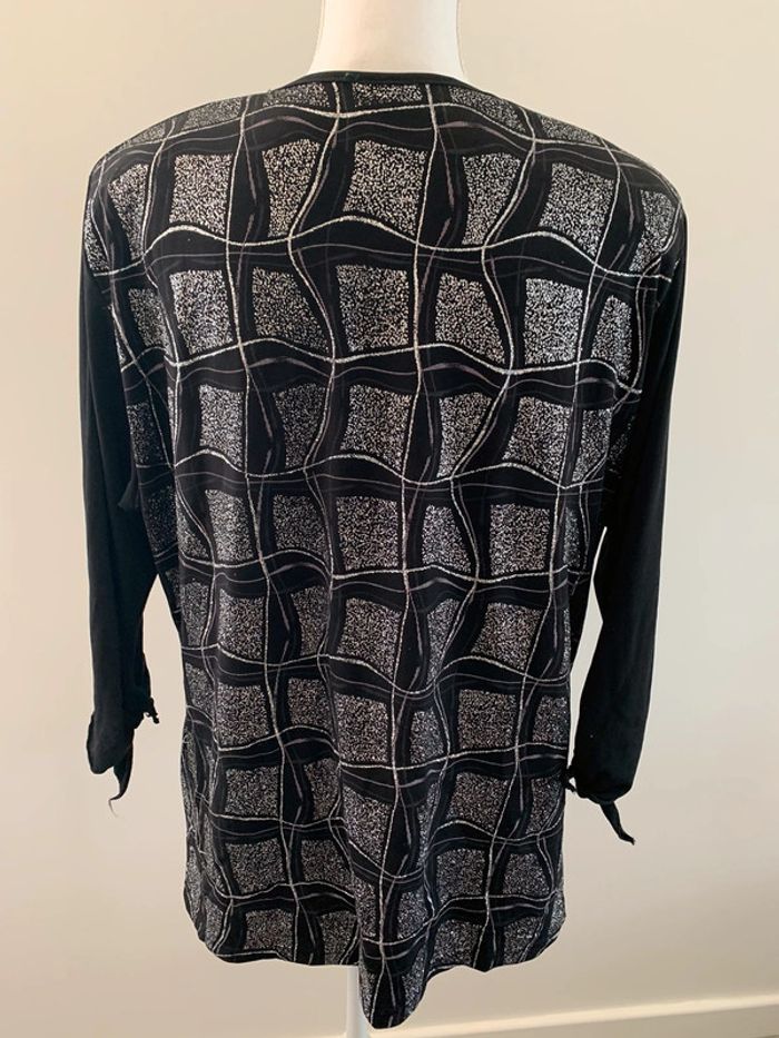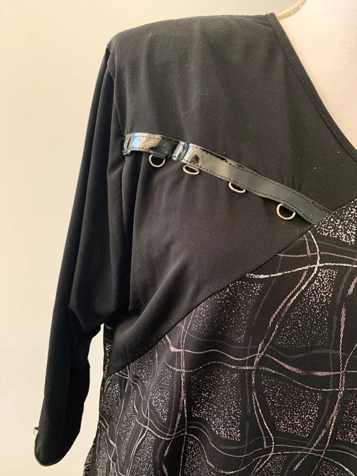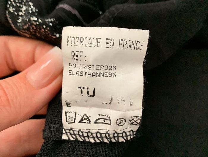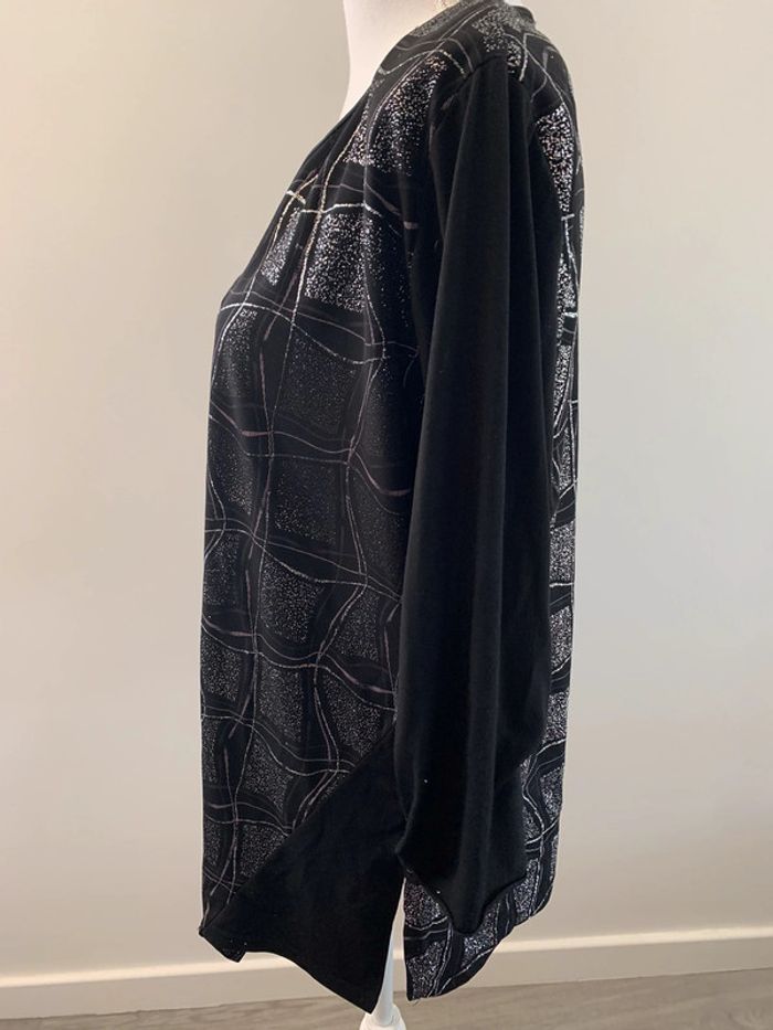 Blouse noire et pailletée - Excellent état - Taille 46/48 équivalent 3XL 4XL (Indiquée Taille unique sur l’étiquette mais il n’en est rien par rapport aux dimensions) - Fabrication française 🇫🇷 - Polyester et elastane - Motifs à l’avant et à l’arrière