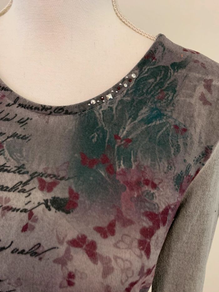 Pull bariolé - Excellent état - Armand Thiery - Gris bleue et rose - Taille 1 équivalent 36/38 - Details strass au niveau du col - Polyester et elastane