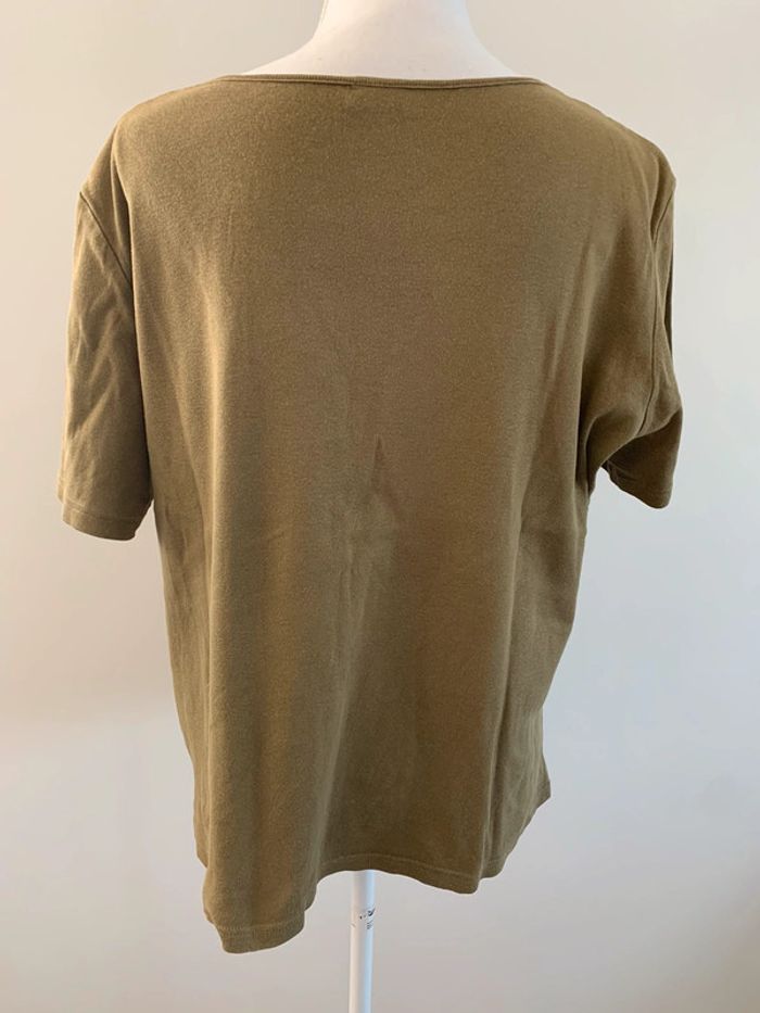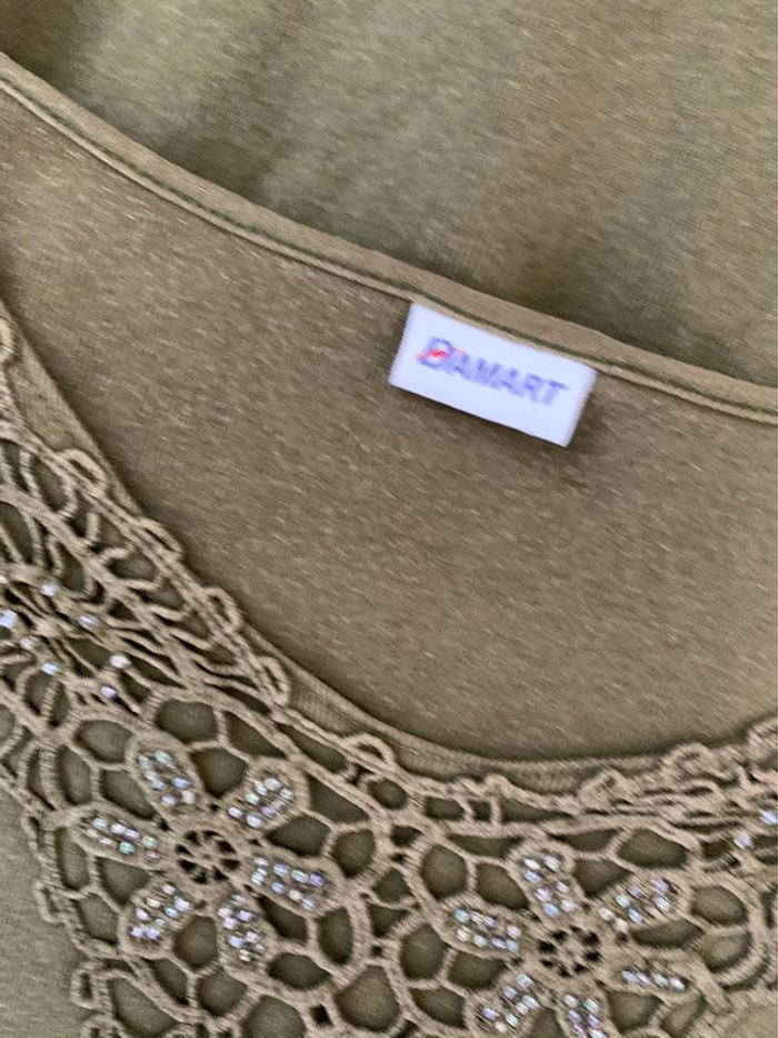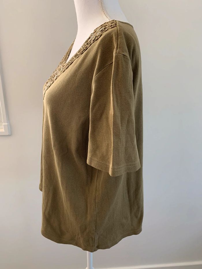T-shirt perles et broderies - Excellent état - Damart, Vintage années 90’ - Taille 46/48 equivalent 3XL 4XL - Kaki et perles multicolores - Details broderies au niveau du col - Manches courtes