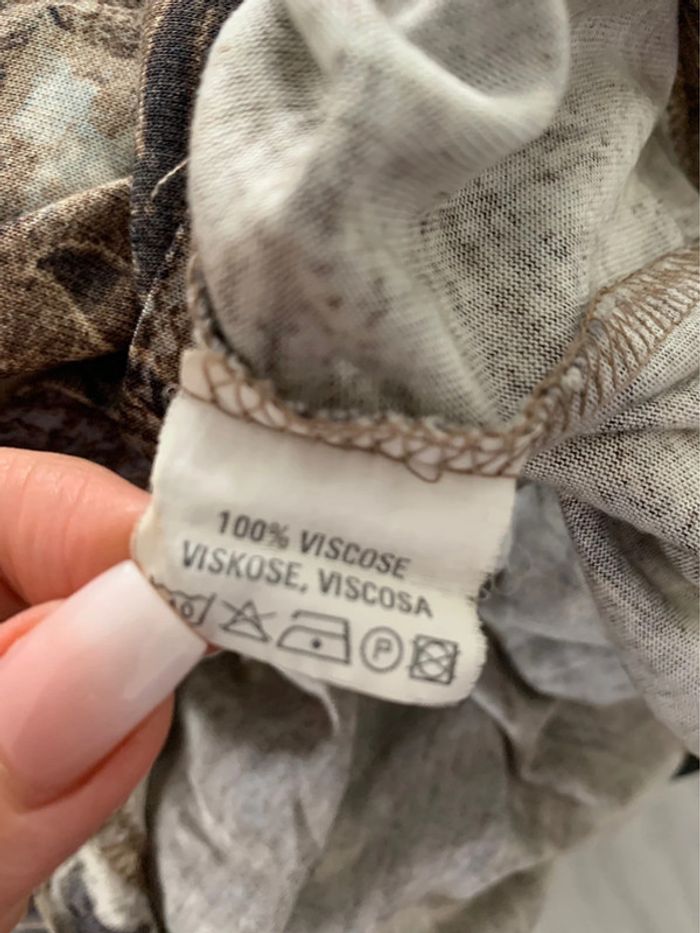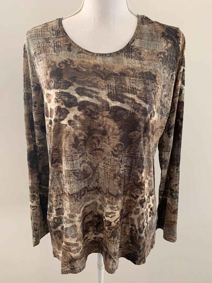 Blouse léopard baroque - Excellent état - Taille 42 équivalent XL - Motifs léopards et baroques - Manches longues - Beige et marron - 100% viscose Dimensions: - 55cm niveau aisselle - 65cm de long - Tissus stretch