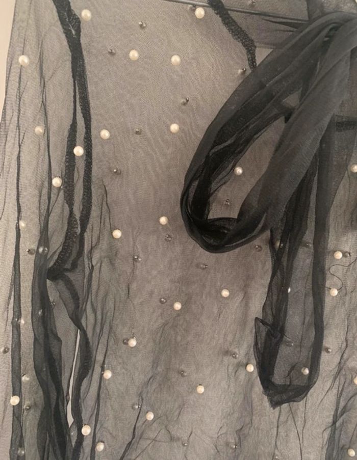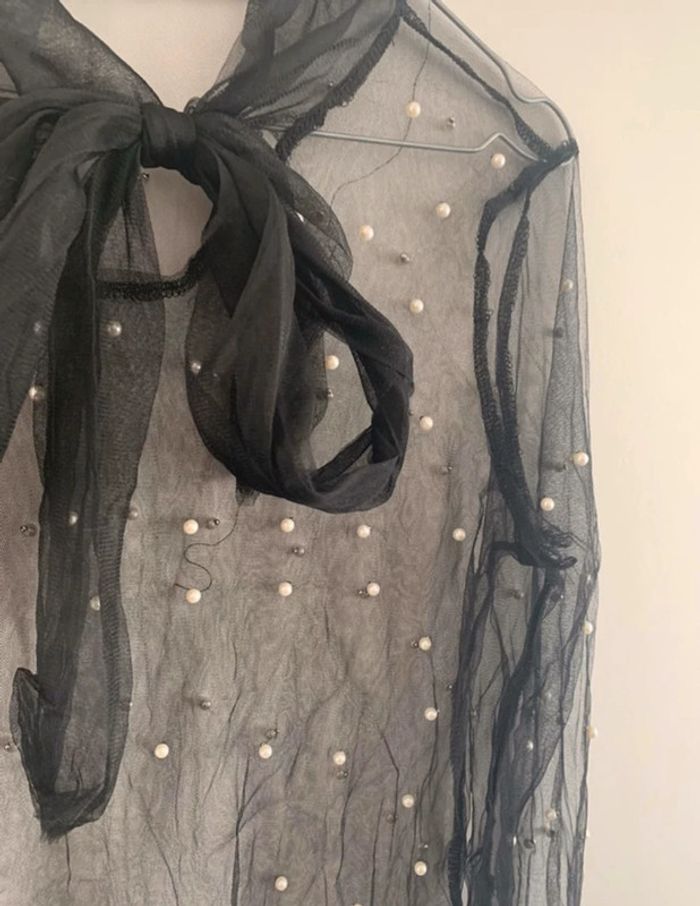 Blouse en organza et perles - Taille L équivalent 40 - Excellent état - Noir et perles blanches - Noeud, flot - Manches longues - Transparente
