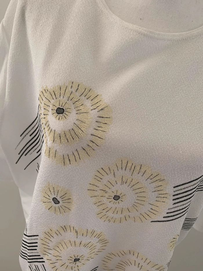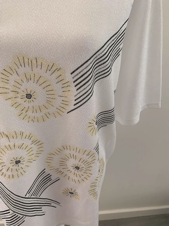 T-shirt bariolé Vintage - Excellent état - Taille 48/50 équivalent 4XL/5XL - Blanc bleu marine et jaune - Motifs ressemblants à des soleils ou météorites - Pas d’étiquette