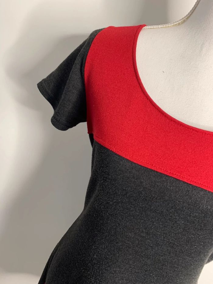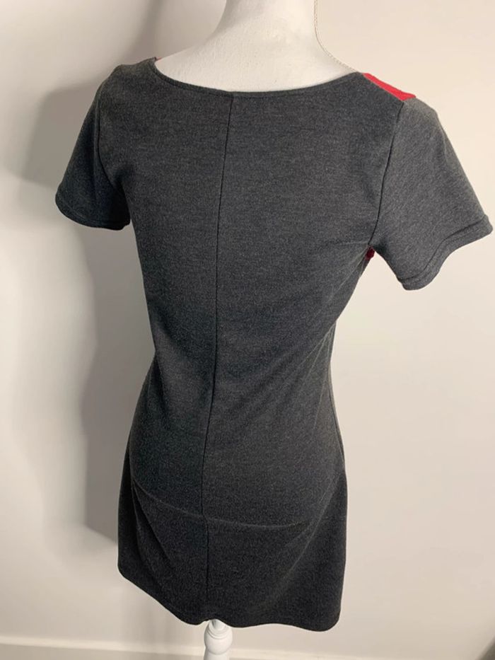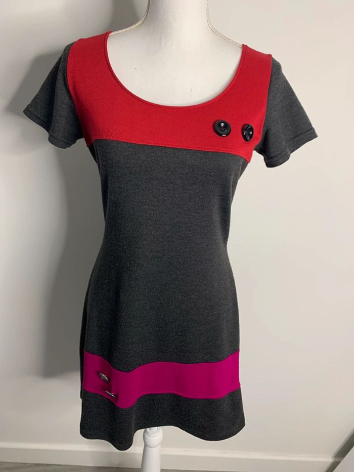 Robe grise rouge et rose - Excellent état - Taille 38 - Tissus stretch - empiècements de couleurs - Boutons décoratifs