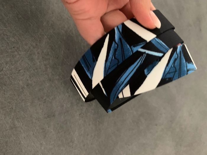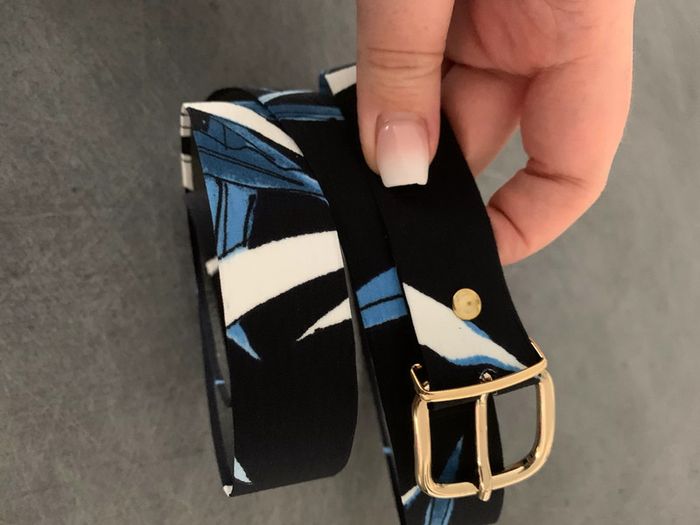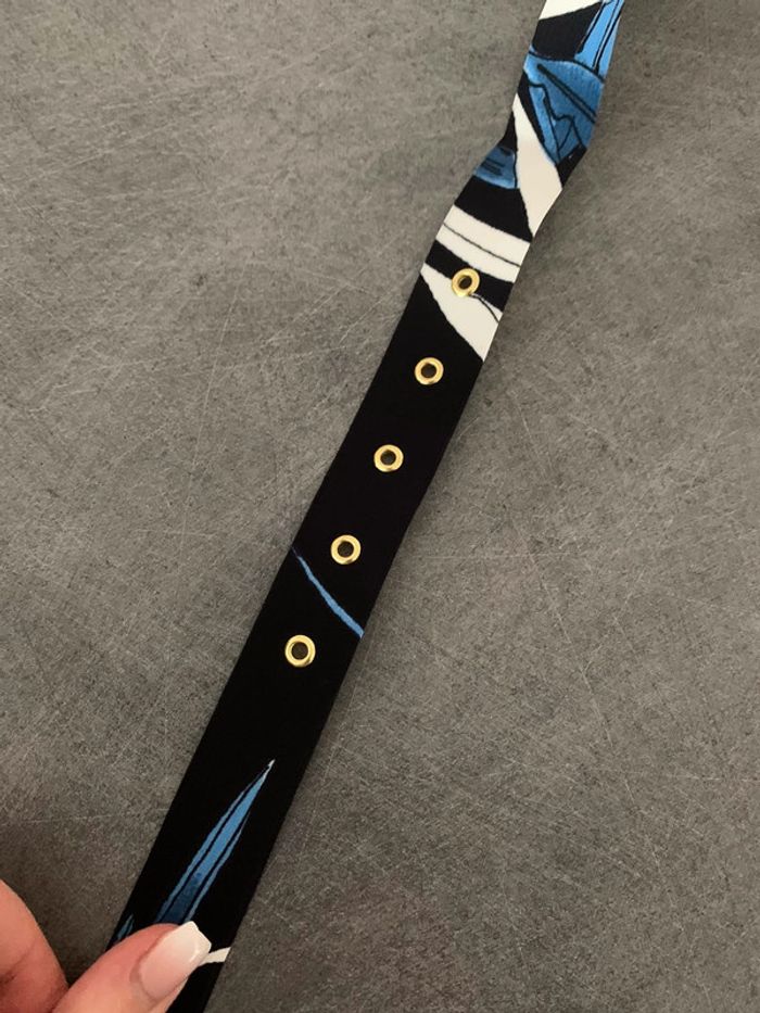 Ceinture en tissus Vintage - Excellent état - Dans les tons bleu - Boucle dorée - Motifs feuilles Dimensions: - Largeur 2,5cm - Longueur 100cm