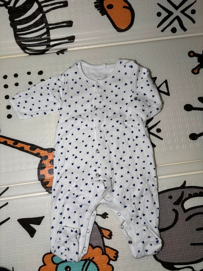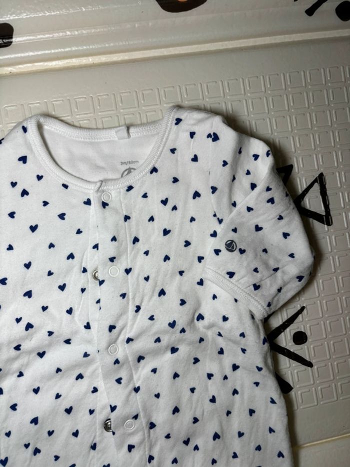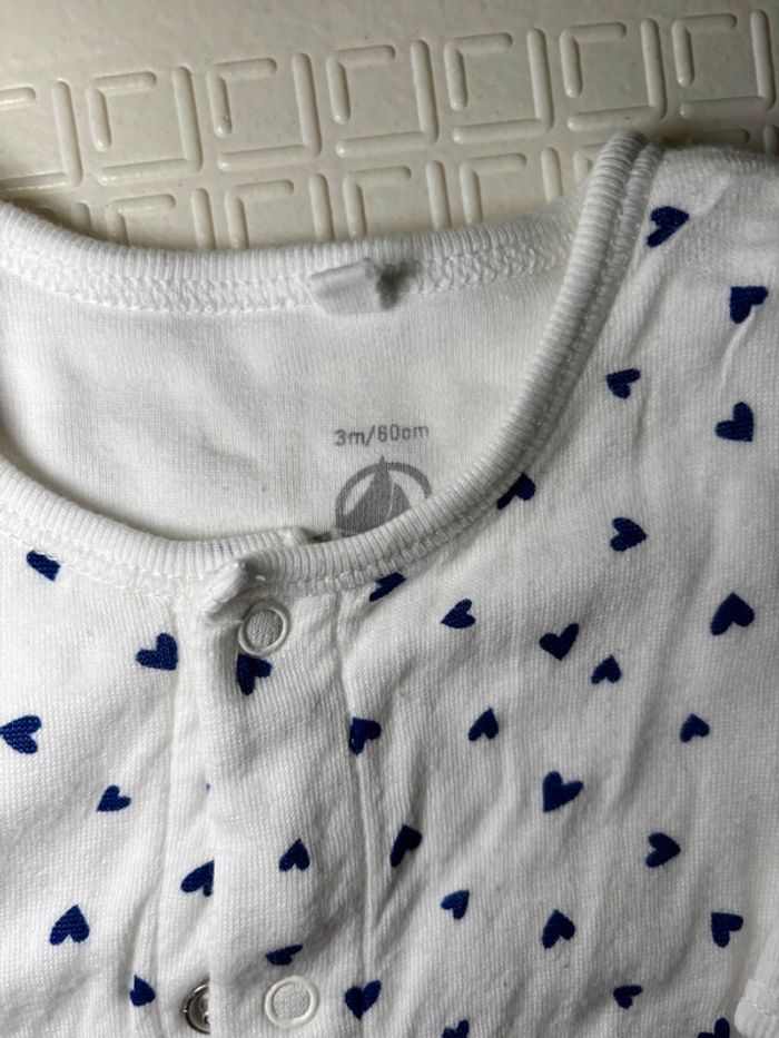 Pyjabody blanc avec cœur bleu 💙 de chez Petit Bateau en taille 3 mois , le body est intégré au pyjama il est en coton épais agréable pour bébé , en excellent état