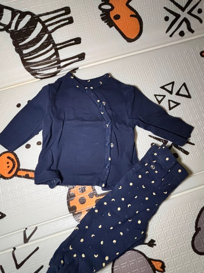 Ensemble 2 pièces en velours motif lune de chez Kiabi en taille 3 mois , les deux peuvent s’assembler, le petit pantalon à les pieds , excellent état