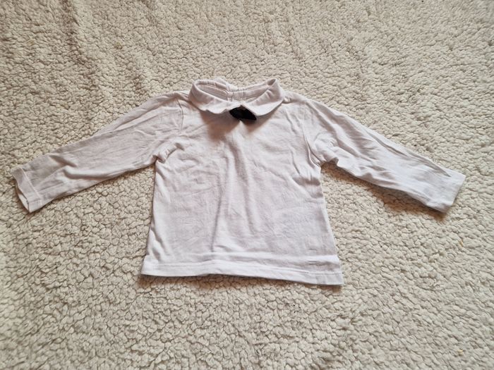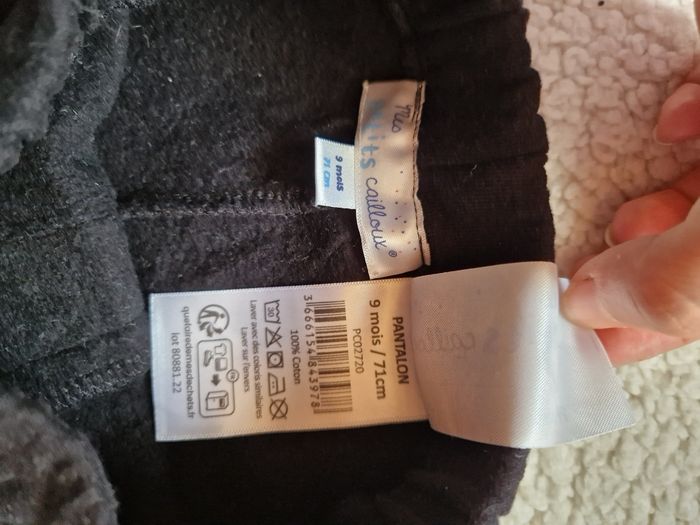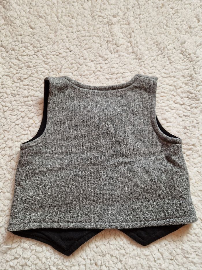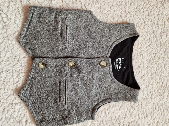 Ensemble costume 9 mois mes petits cailloux : - pantalon chaud noir - polo blanc manches longues, petit nœud noir cousu au col - gilet sans manches boutonné gris chiné Très bon état, juste le revers en bas des jambières boulochés
