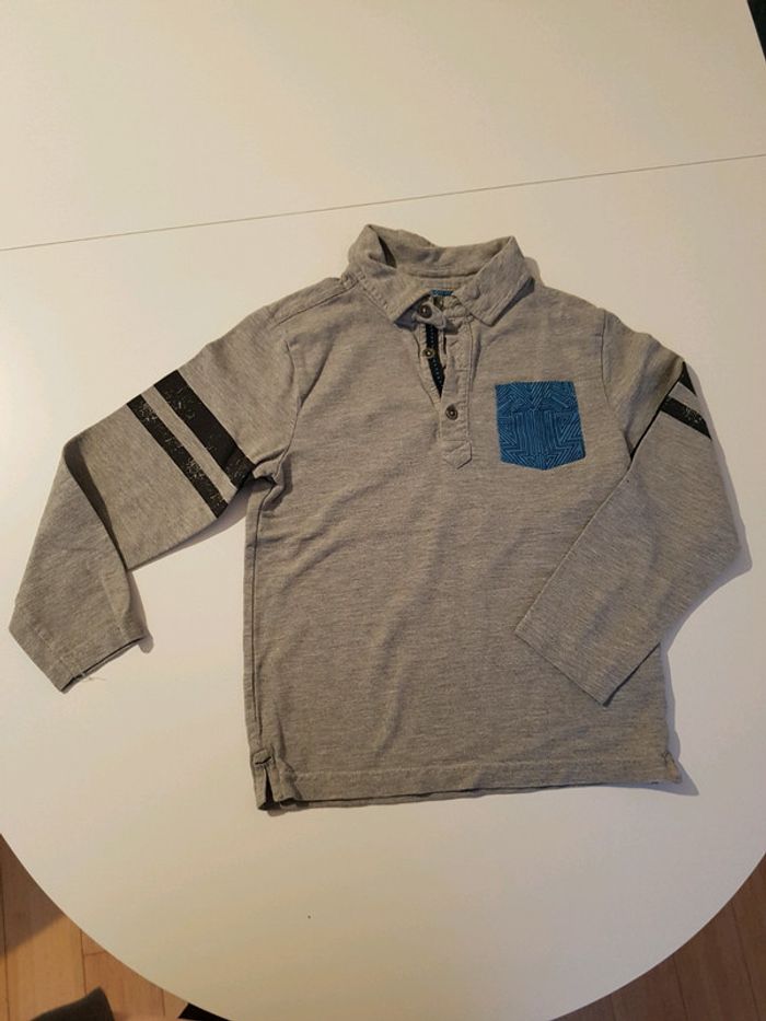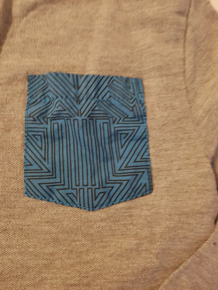 Polo à manches longues pour garçon Taille 8 ans Marque Orchestra Coloris gris , poche bleue et noire, rayures noires sur les manches Très bon état
