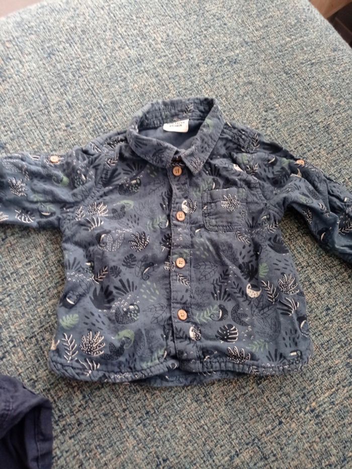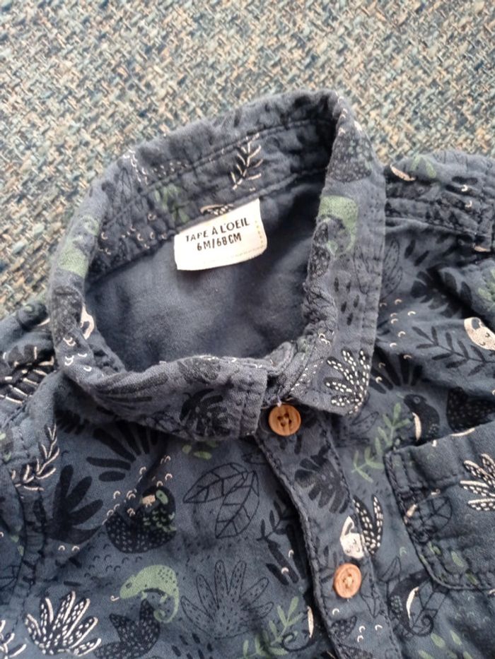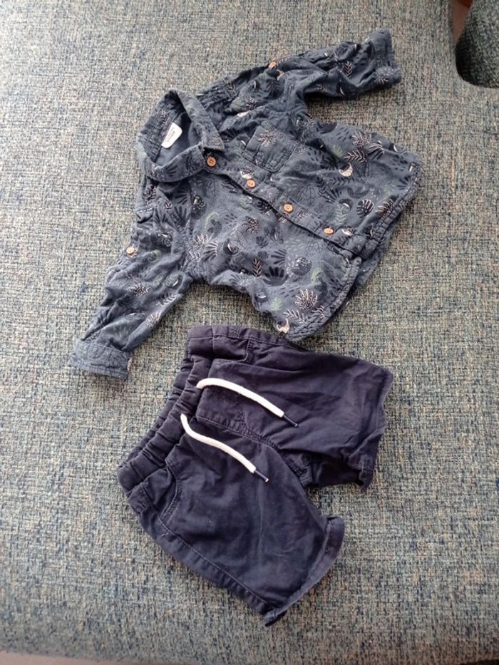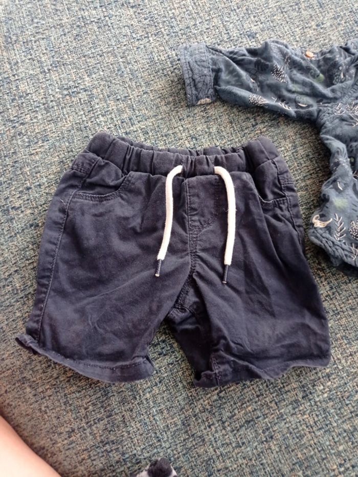 Un bel ensemble été jusqu'à l'automne. C'est du 6 mois. Tape à l'oeil. Short bleu marine et chemise d'été, les manches se raccourcissent. Parfait état