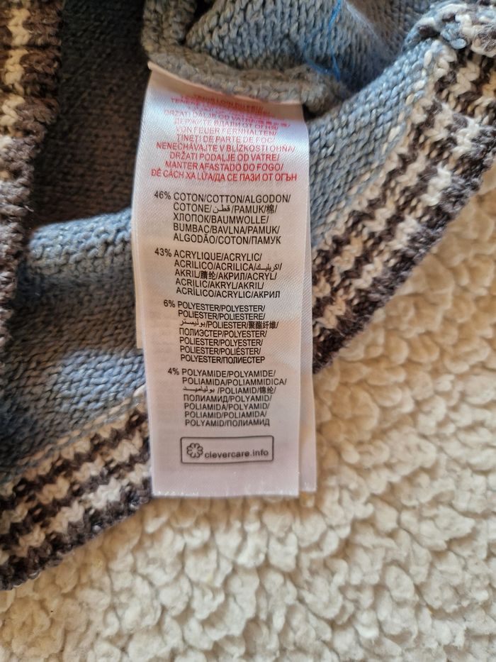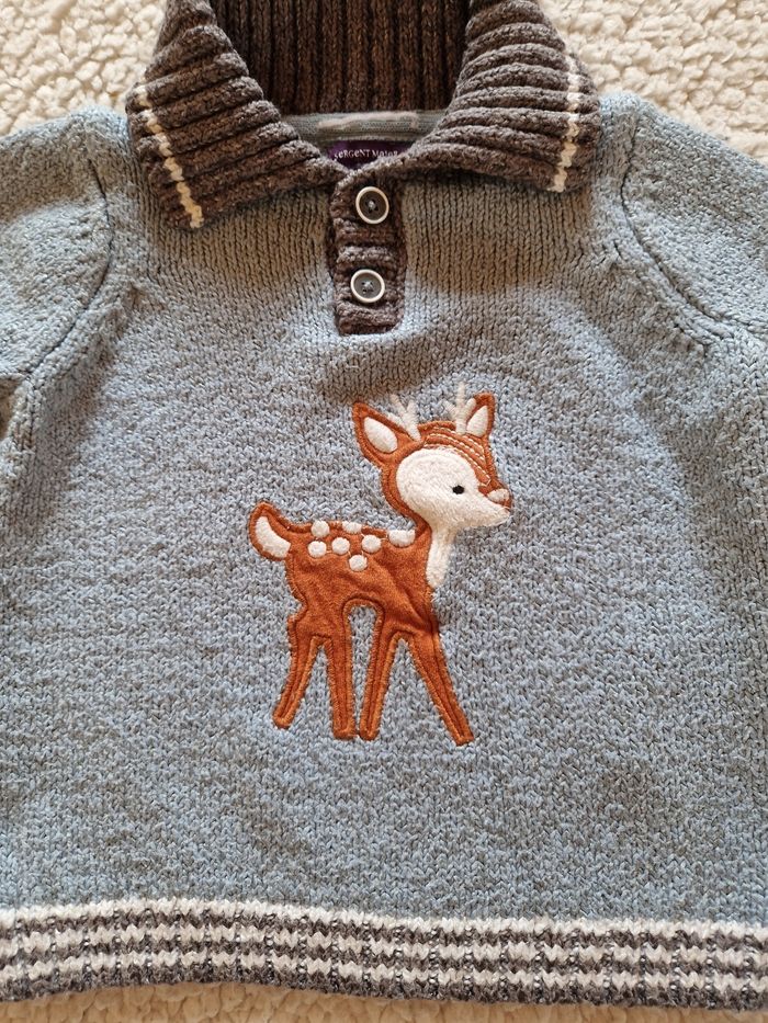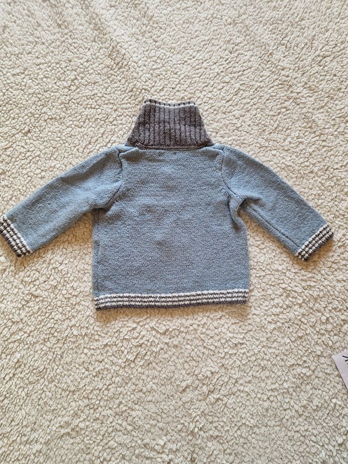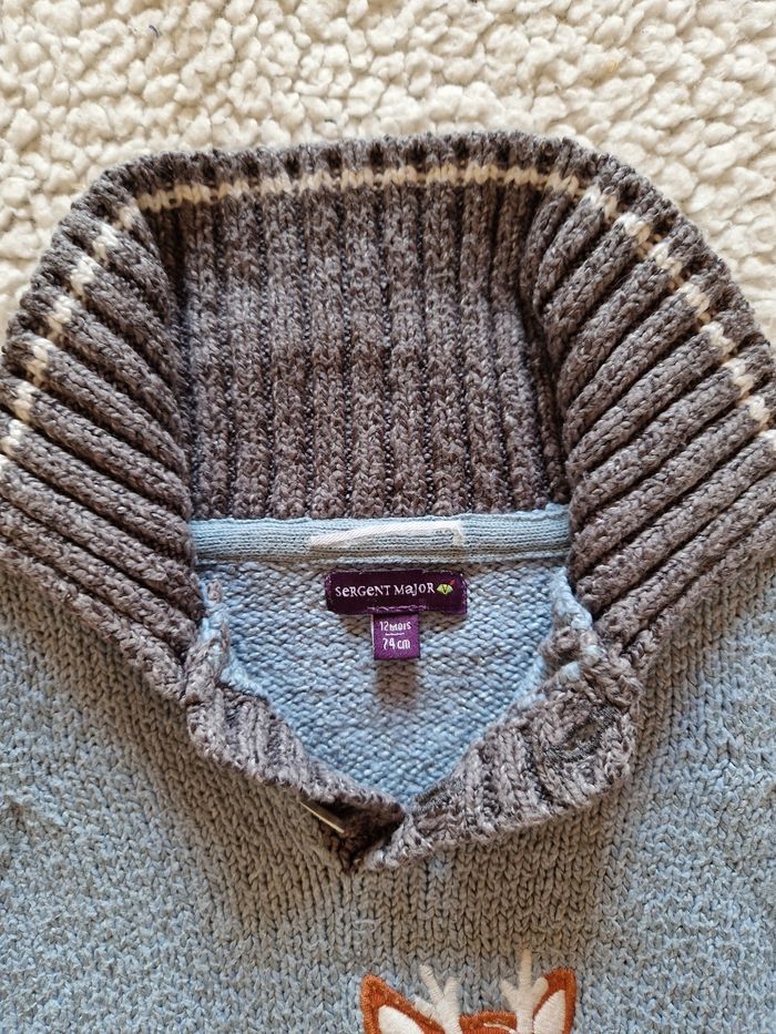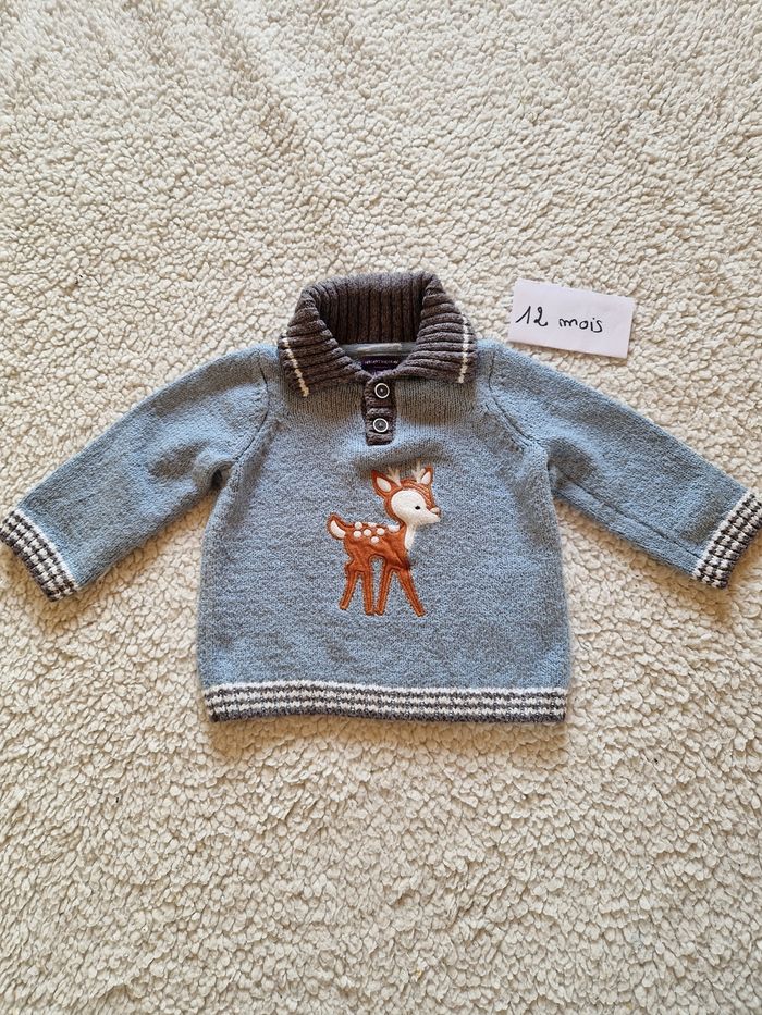 Pull sergent major 12 mois Bleu et gris motif cerf Col châle Très bon état