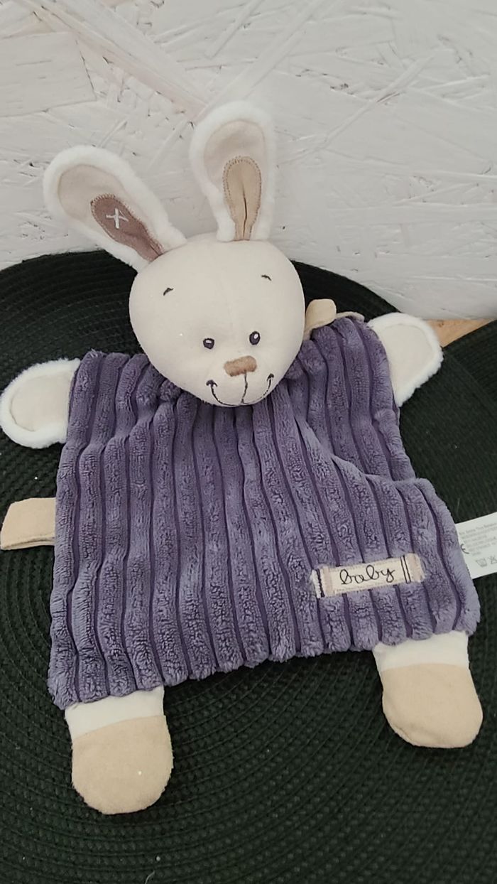 Doudou lapin NICOTOY bleu  corps plat en velours côtelé, tête blanche - photo numéro 1