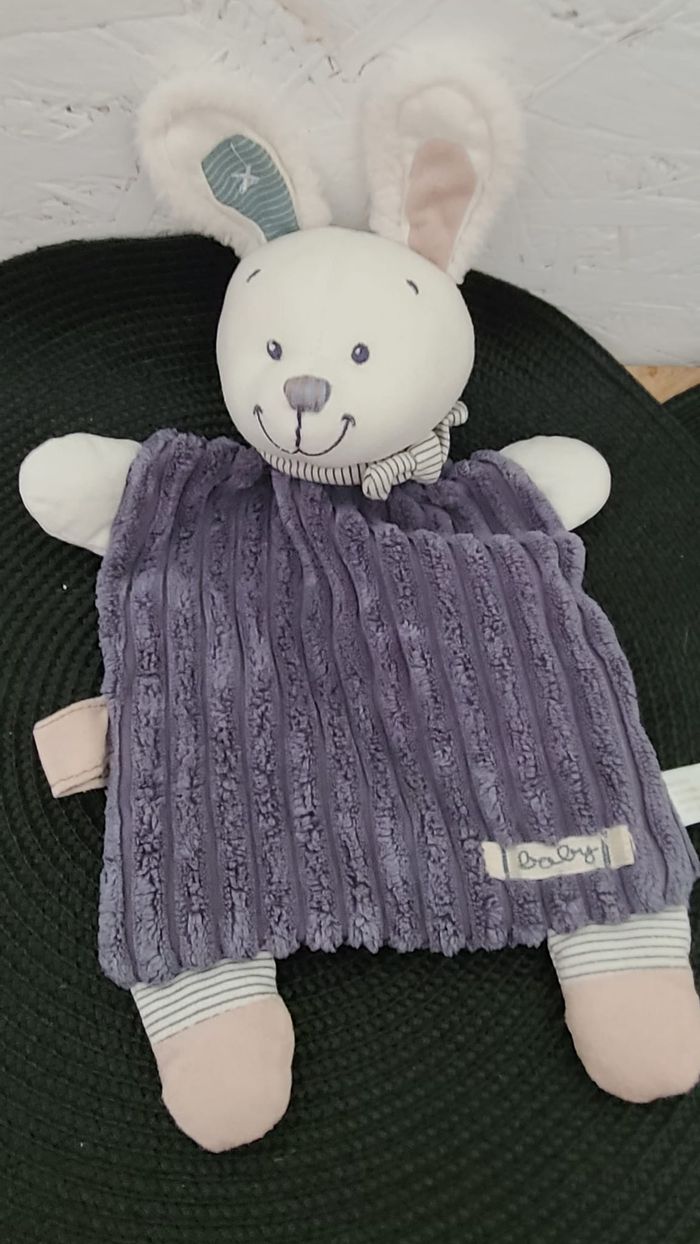 Doudou lapin NICOTOY bleu corps plat en velours côtelé, tête blanche 74