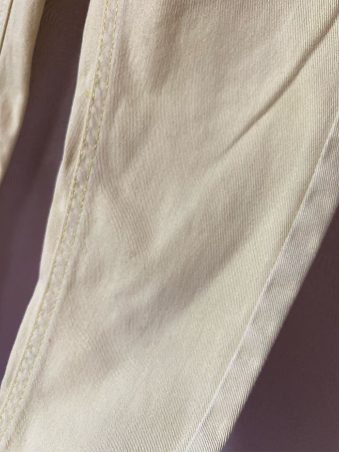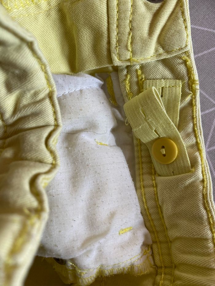 Pantalon jeans skinny jaune Réglable à la ceinture 98% coton 2% elasthane Taille 7 ans 120-125 cm kiabi Bon état car quelques petites taches visibles sur les photos
