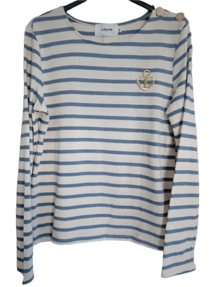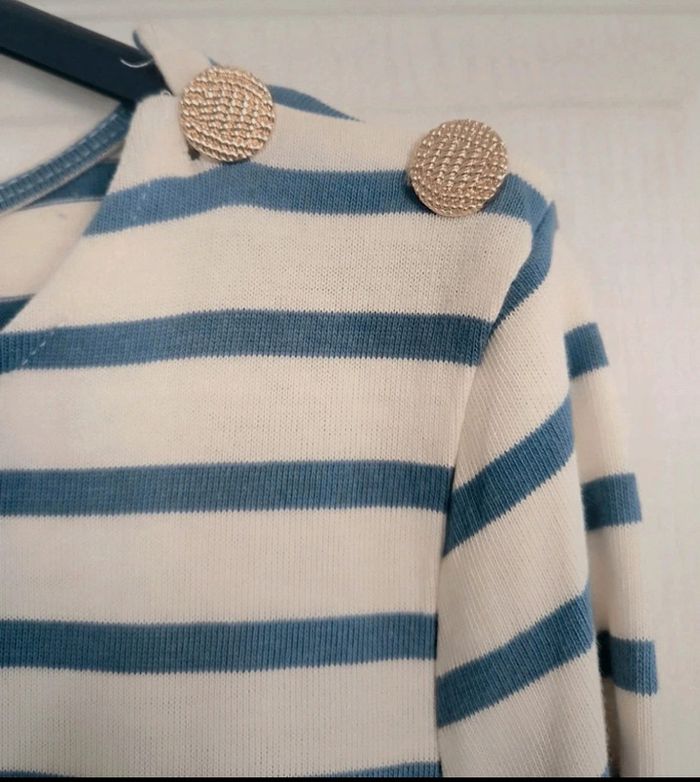 Magnifique pull rayé bleu et ecru Bouton doré Taille M Très doux et confortable