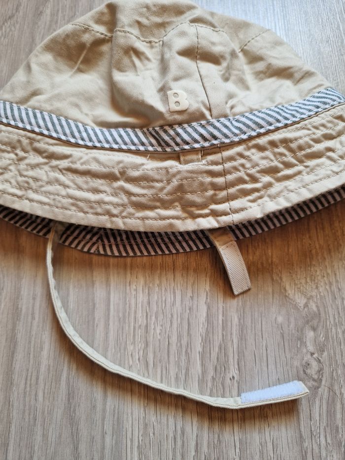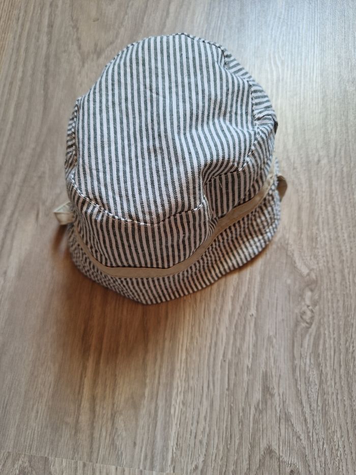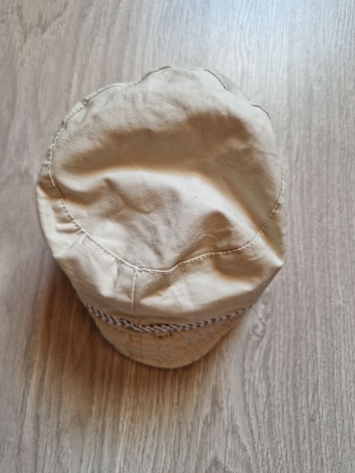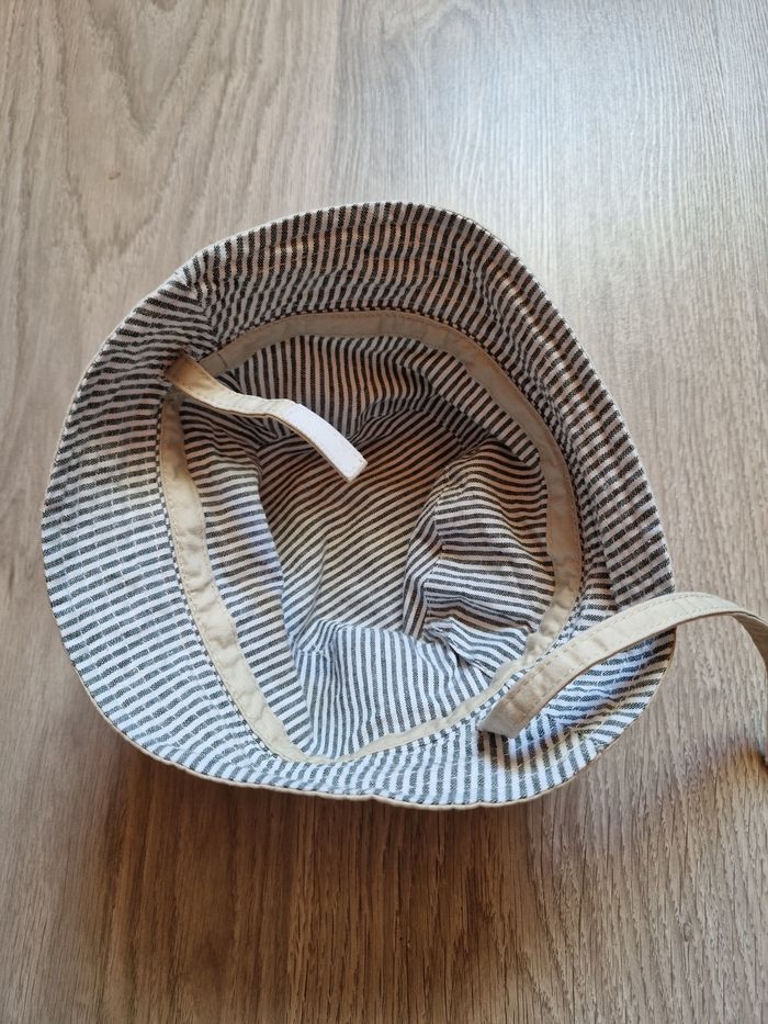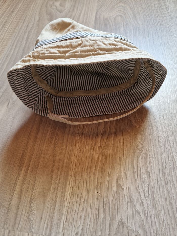 Bob / chapeau obaïbi réversible Côté beige / côté rayé bleu et blanc Lien avec scratch pour tenir sous le menton Correspond à une taille 47 Peu porté car acheté en début d'année mais finalement un peu trop serré quand j'ai commencé à le mettre à mon fils Très bon état