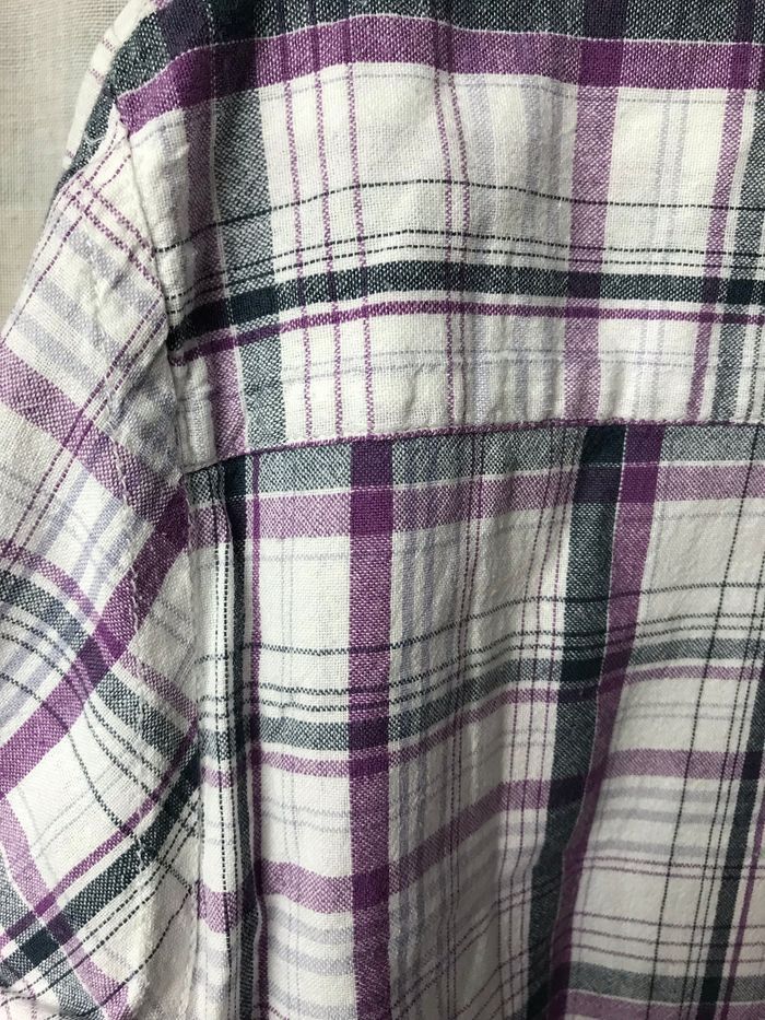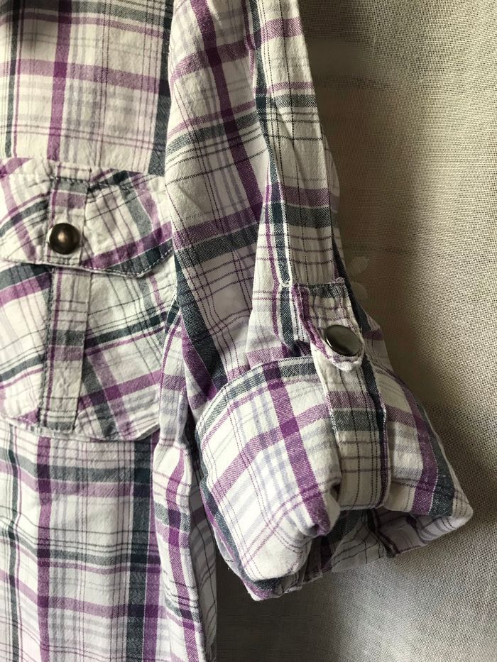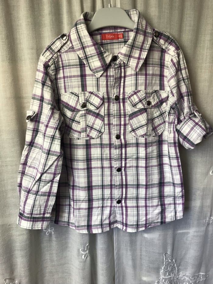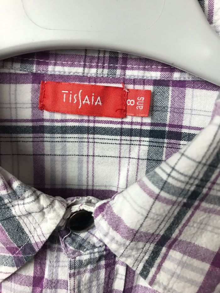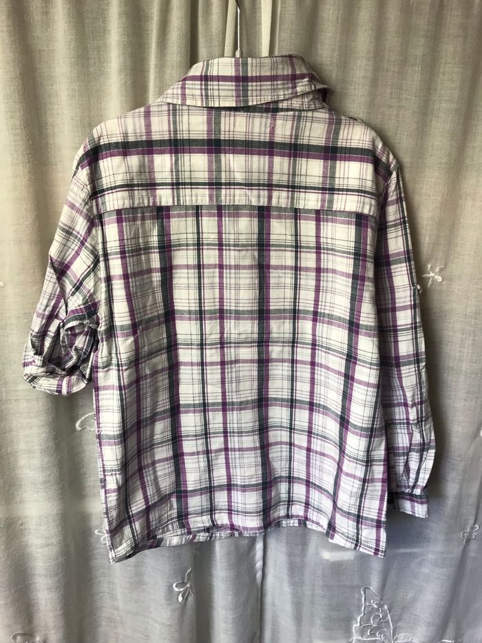 Chemisier chemisette blanche à carreaux écossaise violet/gris western 8 ans , ferme par pressions. Les manches se remontent par patte pression 2 poches avec rabats Tissaia Très bon état