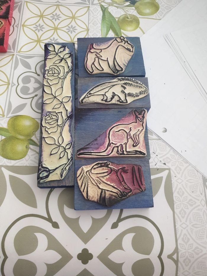 Tampons encreurs vintage en caoutchouc sur support bois en très bon état Ref TIM3