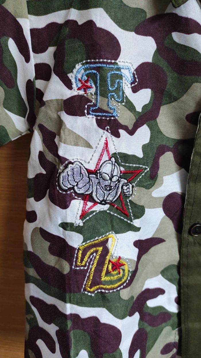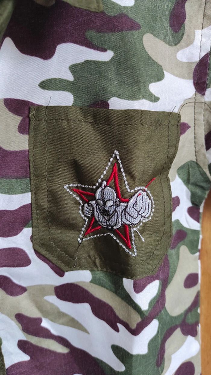 Style militaire, dessins sur le devant avec une poche. Malheureusement pas de taille indiquée mais environ 1 an. Voici les mesures: 29 cm entre les épaules, 38 cm en hauteur.