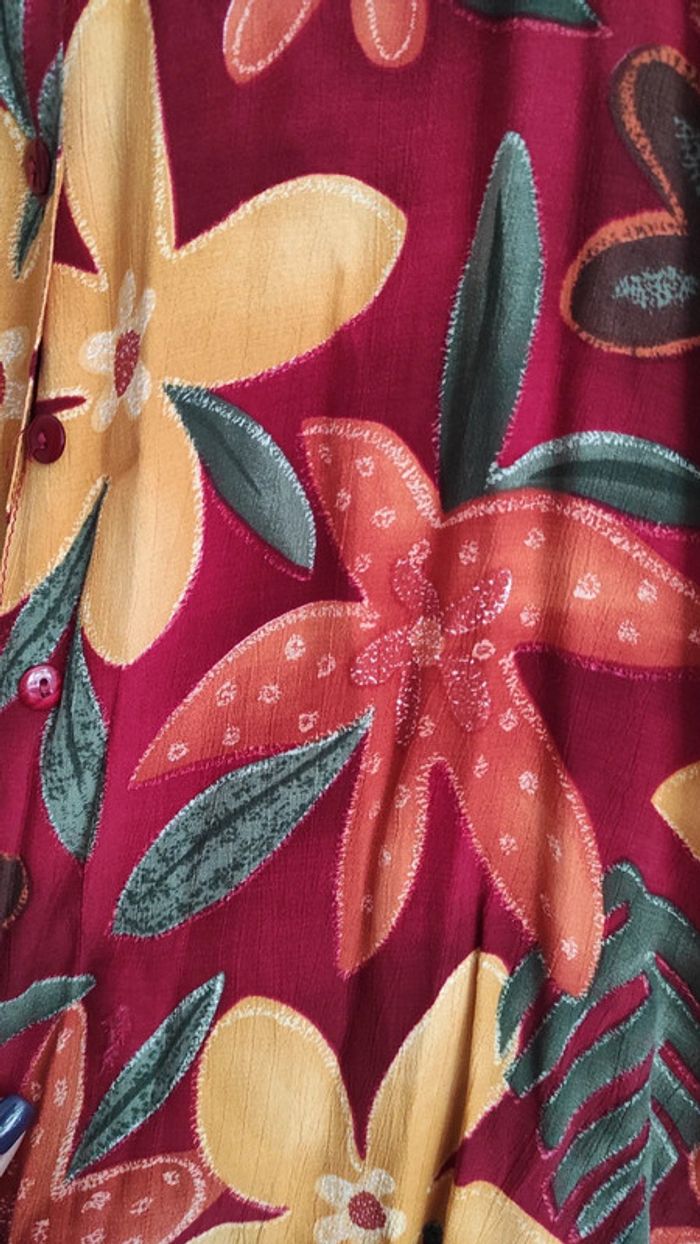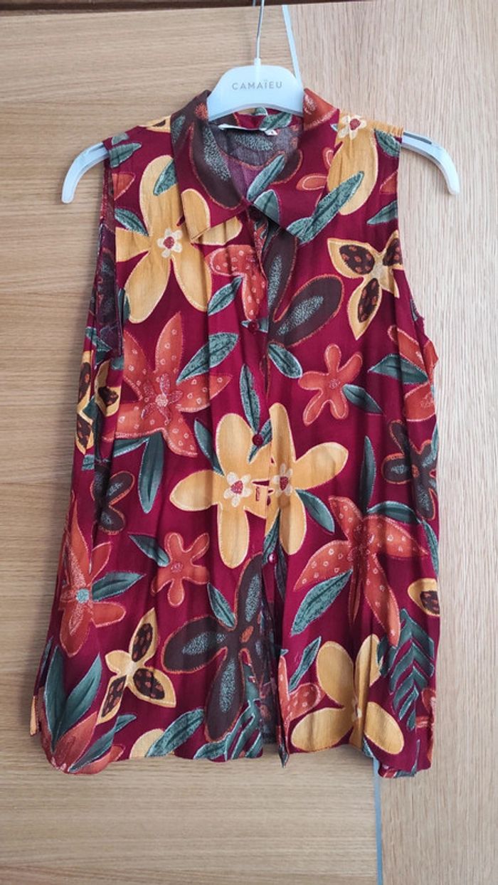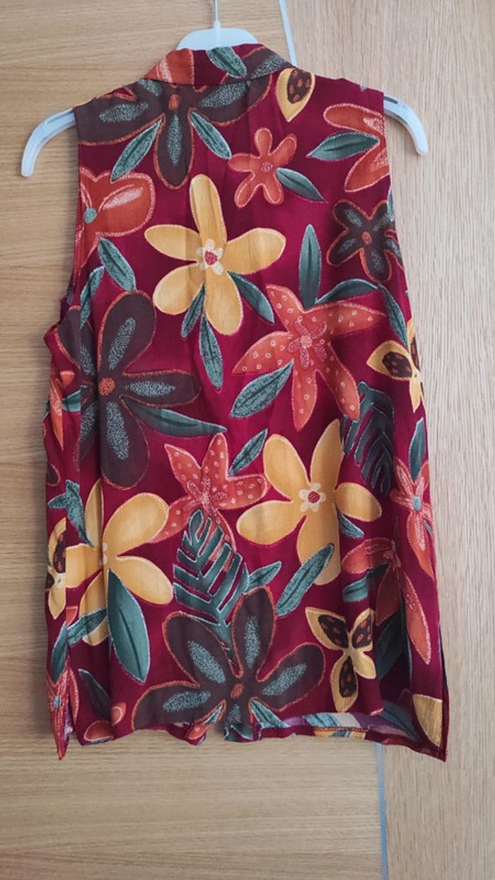 Chemisier femme, motif fleuri. Ici et Maintenant. 32 cm entre épaules, 44 cm sous aisselles, 66 cm en hauteur.