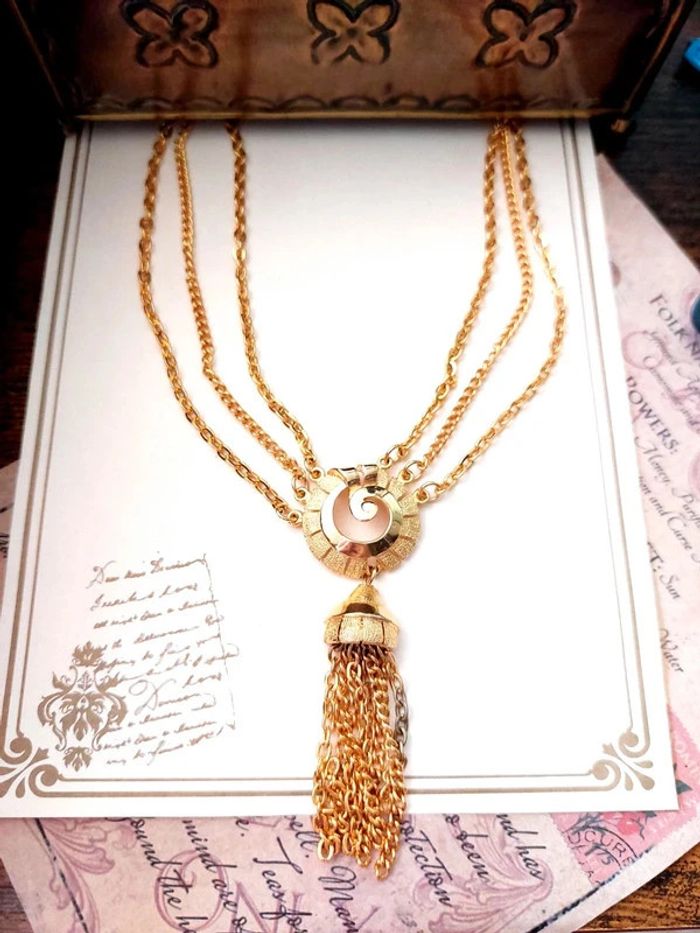 Magnifique collier vintage, multirangs, 3 chaîne couleur or, avec pendentif médaillon. Très bon état excepté une petite decoloration sur quelques maillon du pendentif. D'autres bijoux sont à découvrir dans mon dressing #bijouxsupernova 🌌 Je suis disponible pour d'autres renseignements / ou demandes de lot. 🌌 Les envois se font soit le jour même ou en 72h maxi ! 🌌 J'accepte les offres raisonnables et les réductions sont activées sur les lots, de plus, un petit cadeau est toujours rajouté au colis. Tags Vintage chic hippie 60's 70's 80's 90's 00's Y2k foulard soie collier bijoux fantaisie signature boucles d'oreilles bague bracelet manchette jonc parure pendentif médaille religieux ancien brocante antiguo antico juwelen bigiotteria joyería antigua antique antik vieux victorien belle époque 1920 art déco art nouveau 1930 années 50 lot gros lot lotto set carré friperie poinçon pièce rare argenté doré bronze perles strass