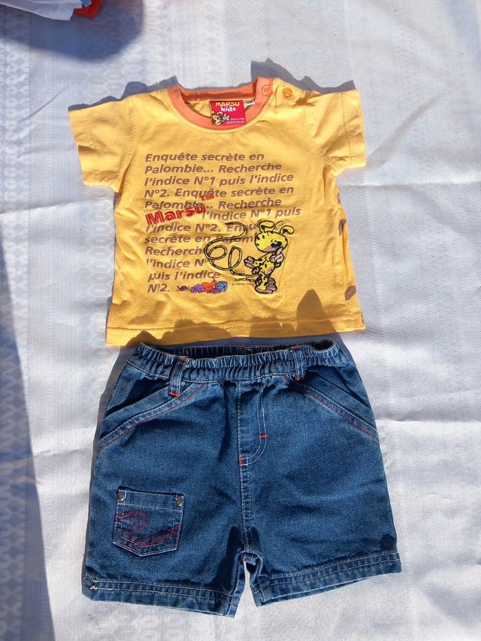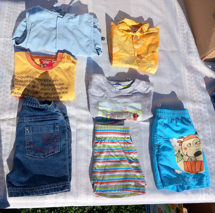 Lot été 12 mois garçon comprenant - 1 veste sans manches à capuche - 1 tee-shirt marsupulami - 1 short en jean - 1 ensemble tee-shirt short - 1 chemise manches courtes - 1 short de bain Le tout en TBE pas de tâches pas de trous plusieurs marques ,kimbaloo,in extenso...