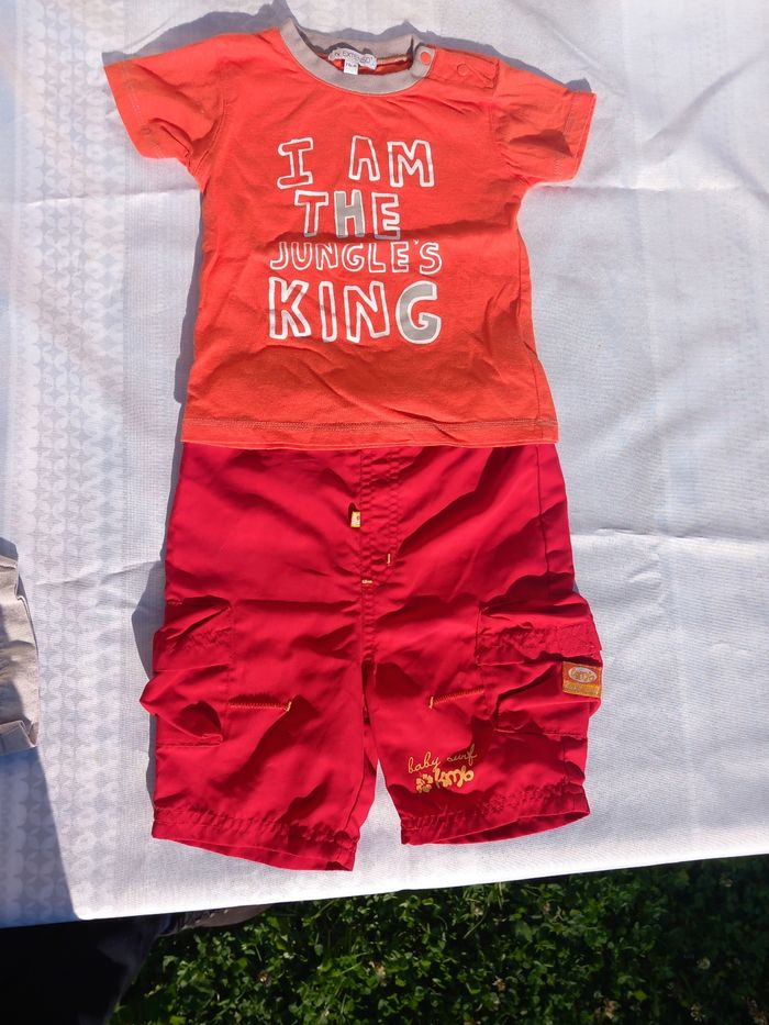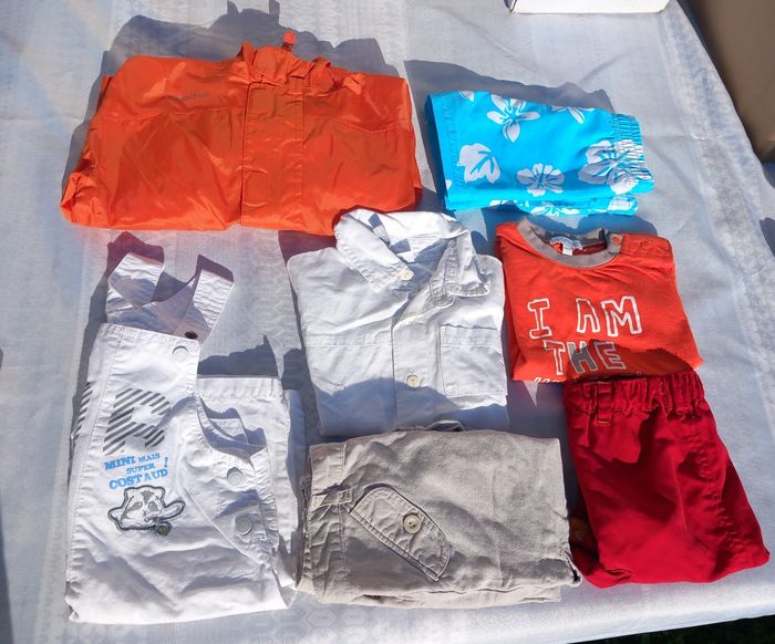 Lot 12 mois été garçon comprenant : - 1 kway - 1 salopette - 1 chemise manches courtes - 1 pantalon en lin - 1 ensemble tee-shirt short - 1 short de bain Marque tout compte fait, obaïbi, queschua, in extenso... Le tout est TBE pas de tâches pas de trous pressions ou boutons nickels