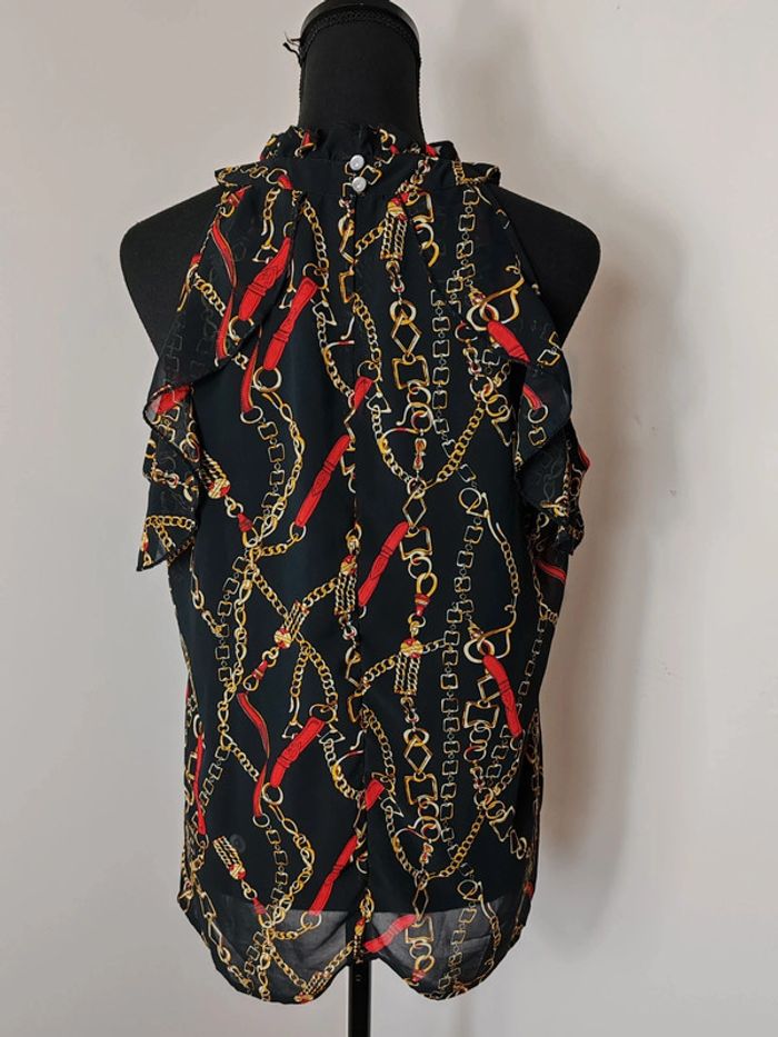 Très jolie blouse manches courtes avec volant, col montant. Motifs de chaînes. Sans étiquette correspond à un 38 #vetementsfemme38_alycia1628 #teeshirtfemme_alycia1628