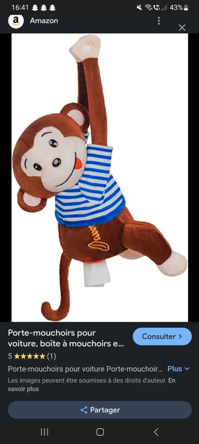 Porte mouchoirs, qui peut être accroché dans une voiture, sur une armoire ou autres.. Coûte plus de 14€ sur amazon, jamais servi Le système d'accroche se fait par des pressions Les mouchoirs sont stockés dans le ventre sur singe et l'enfant (ou l'adulte) peut attraper un mouchoir en cas de besoin Lot et réduction possible :)