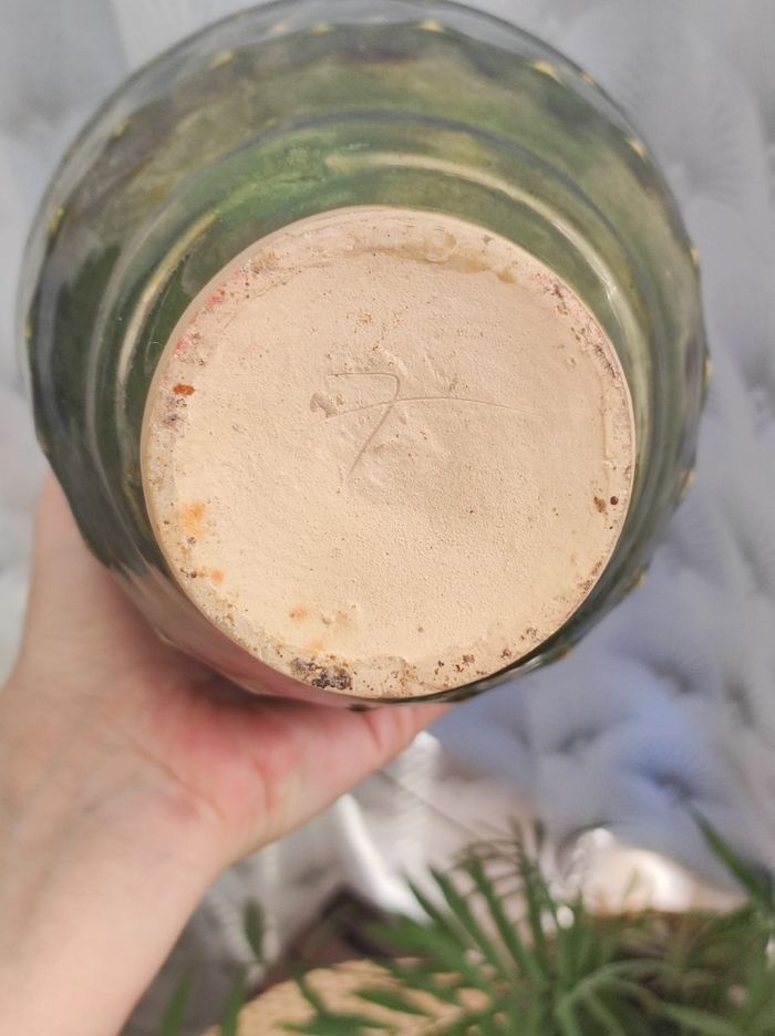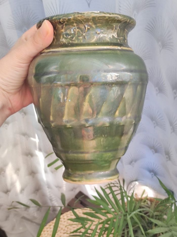 Vase amphore vert a reflet. Inscription numéro 7 sur le dessous Dimensions Hauteur 18,5 Ouverture 11,5 de diamètre