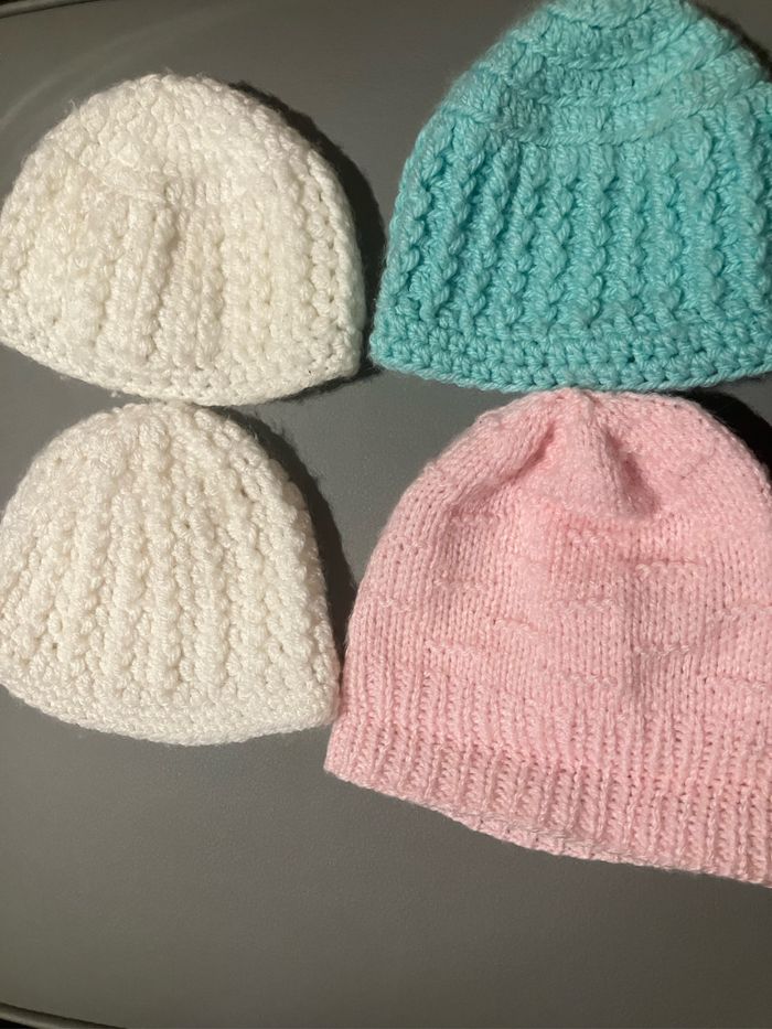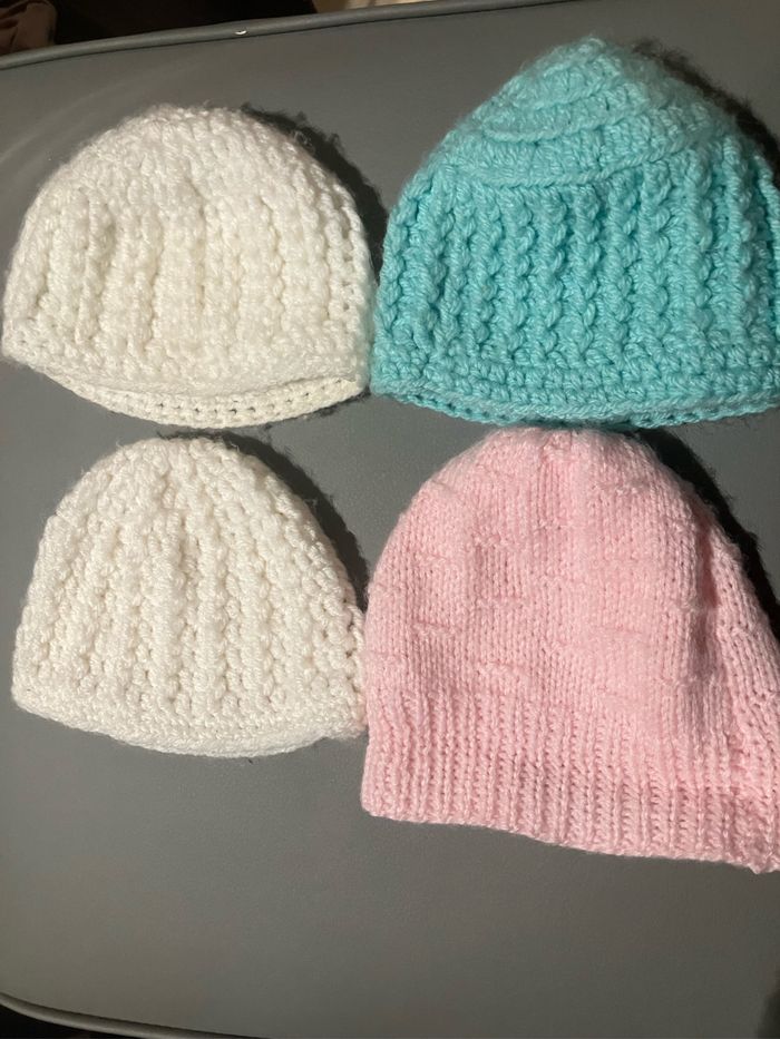 Vend lot de 4 bonnets en laine faits à la main taille 3/6 et 9 mois . Très bon états