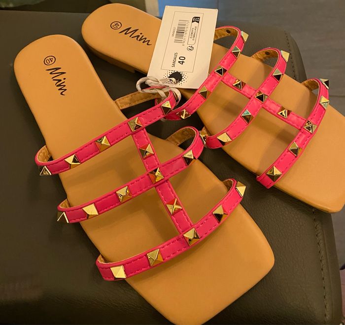 Sandales claquettes Mim - Neuf - Taille 40 Je vends une paire de sandales/claquettes de la marque Mim. 🌸Couleur : rose avec clous dorés 🌸Pointure : 40 🌸État : neuf avec étiquette Style tendance avec brides croisées et clous dorés pour un look chic et estival.