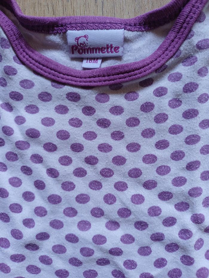 Souvent portés mais toujours en très bon état. Un de marque Pommette et l'autre sans marque #Fille18moisSacha #bodie #violet #blanc #pois