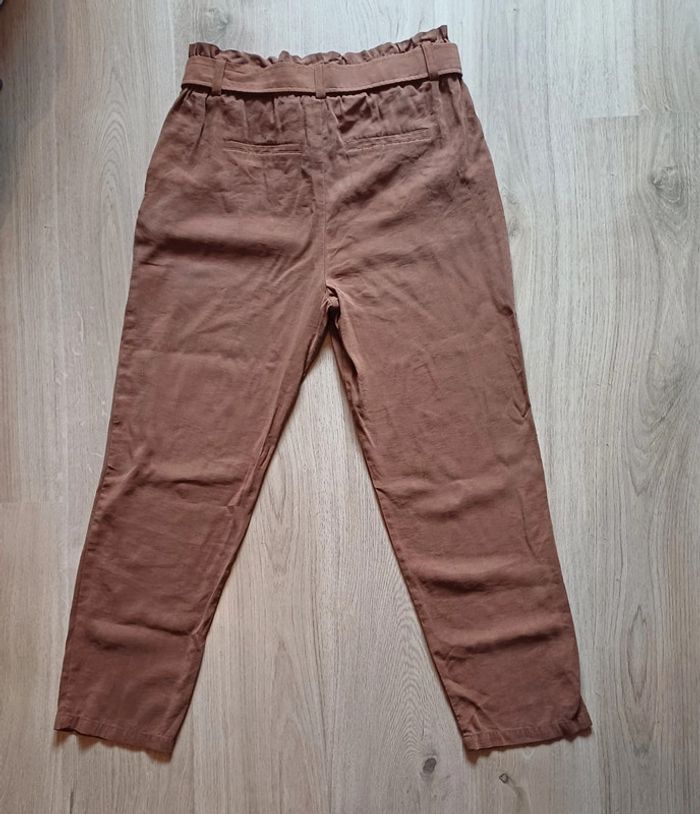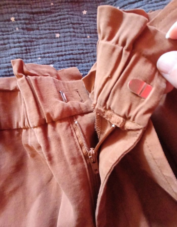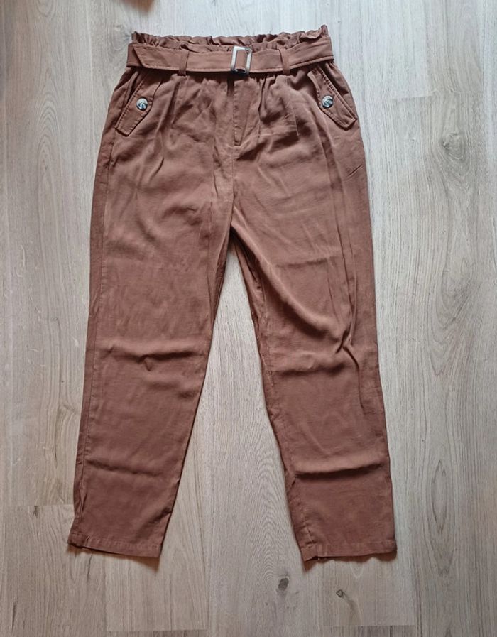 Très joli pantalon paperbag avec sa ceinture de couleur camel. Il a été porté une fois mais est toujours en très bon état. Il est fluide et très léger. Il se ferme via une agrafe. (Il y a avait à l'origine un bouton à l'intérieur en plus mais celui-ci s'est décousu au lavage l'agrafe et la ceinture suffisent à elles seules) #VêtementsetAccesoiresFemmeAudreyB #pantalon #paperbag #léger #fluide #camel