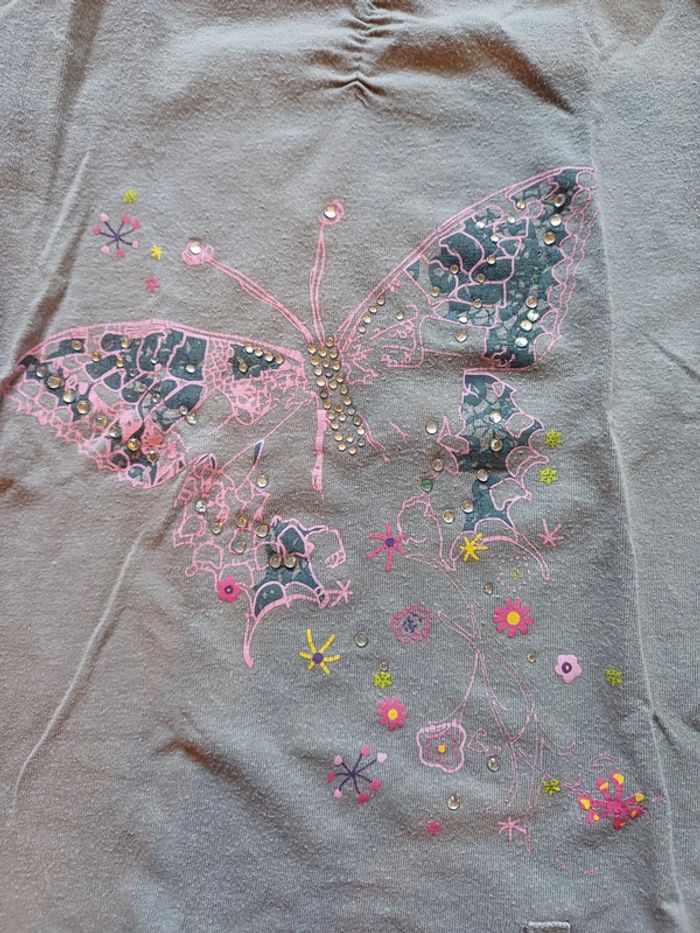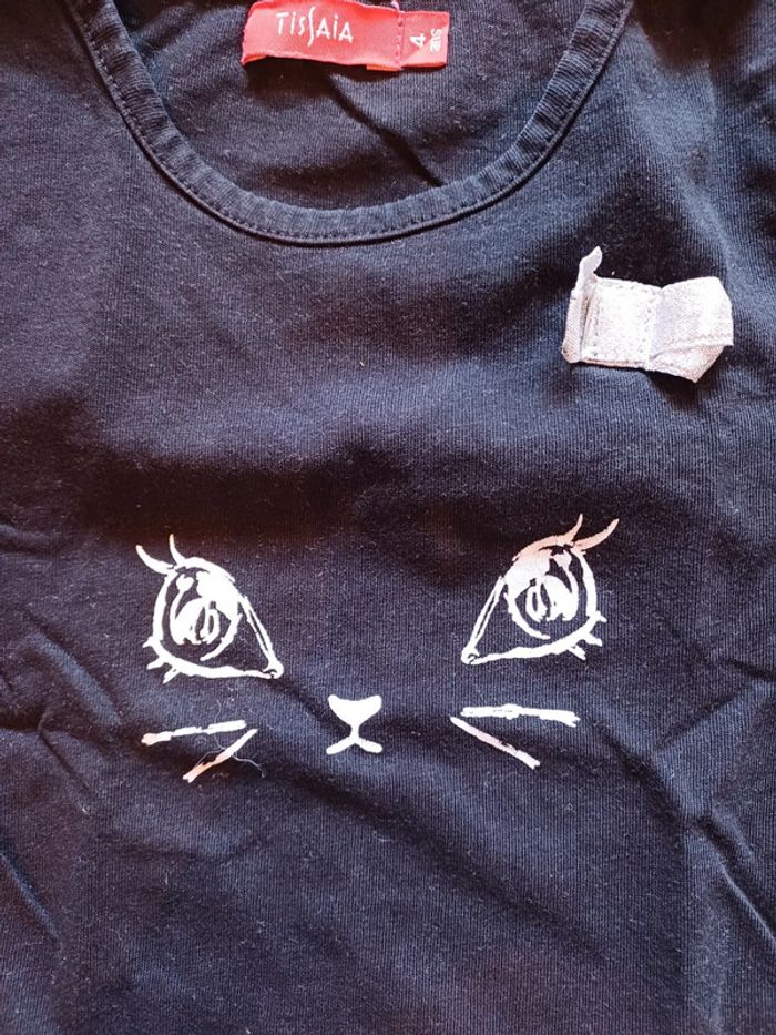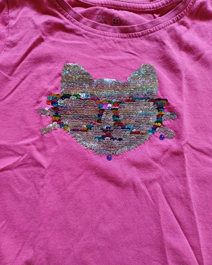 6 tee-shirts en très bon état. - 2 Kiabi. Un bleu clair et un noir à motif roller - 2 U collection à paillettes - 1 noir motif chat Tissaia - 1 gris à motif papillon sans marque #Fille4ansSacha #teeshirt #chat #paillettes