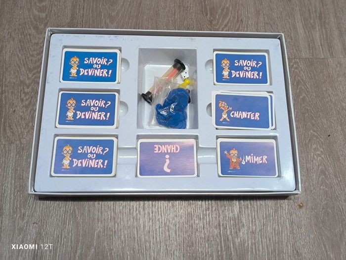 #jeudesocietealison02270 Savoir et deviner 197 cartes Chanter 60 cartes Chance 10 cartes Mimer 29 cartes 100 jetons 2 pions 1 de 1 sablier Comme sur les photos Bon état en général
