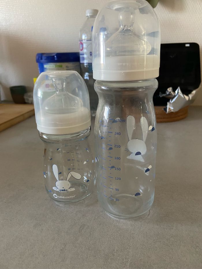 Biberon en verre 1 de 130ml avec tétine 0 1 de 270ml avec tétine taille 1 avec 3 vitesses Jamais servie juste sortis de leurs emballages et laver