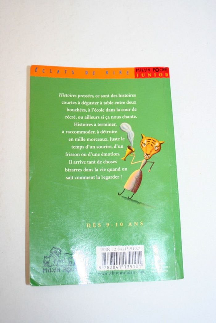 Histoires pressées de Bernard Friot, Milan Poche Junior, livre un peu corné, dès 9/10 ans, 109 pages, 110g Histoires pressées, ce sont des histoires courtes à déguster à table entre deux bouchées, à l'école dans la cour de récré, ou ailleurs si ça nous chant. Histoires à terminer, à raccommoder, à détruire en mille morceaux. Juste le temps d'un sourire, d'un frisson ou d'une émotion. Il arrive tant de choses bizarres dans la vie quand on sait comment la regarder!
