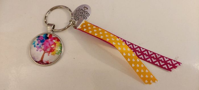 Porte clés métal argenté avec cabochon, breloque et rubans.