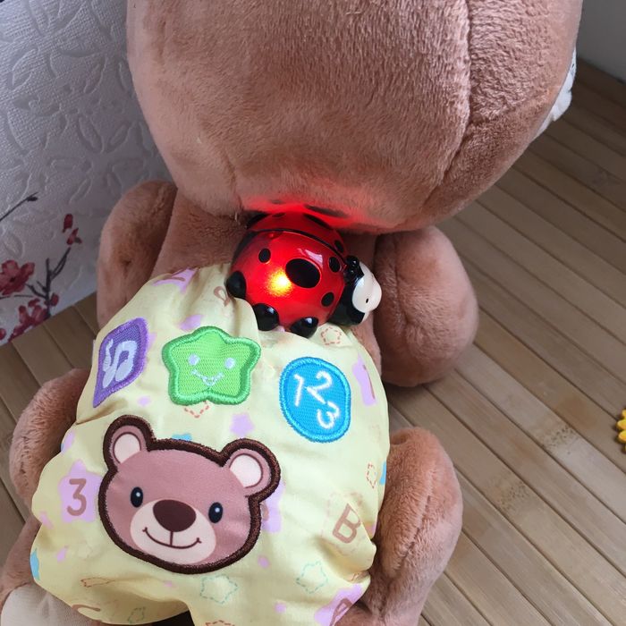 Une coccinelle lumineuse sur le dos de l'ourson qui clignote au rythme des mélodies 3 chansons, 2 phrases chantées et 10 mélodies Réglage du volume sonore 4 boutons interactifs pour découvrir les formes et couleurs Contenu : 1x ourson 1,2,3 pour apprendre la marche