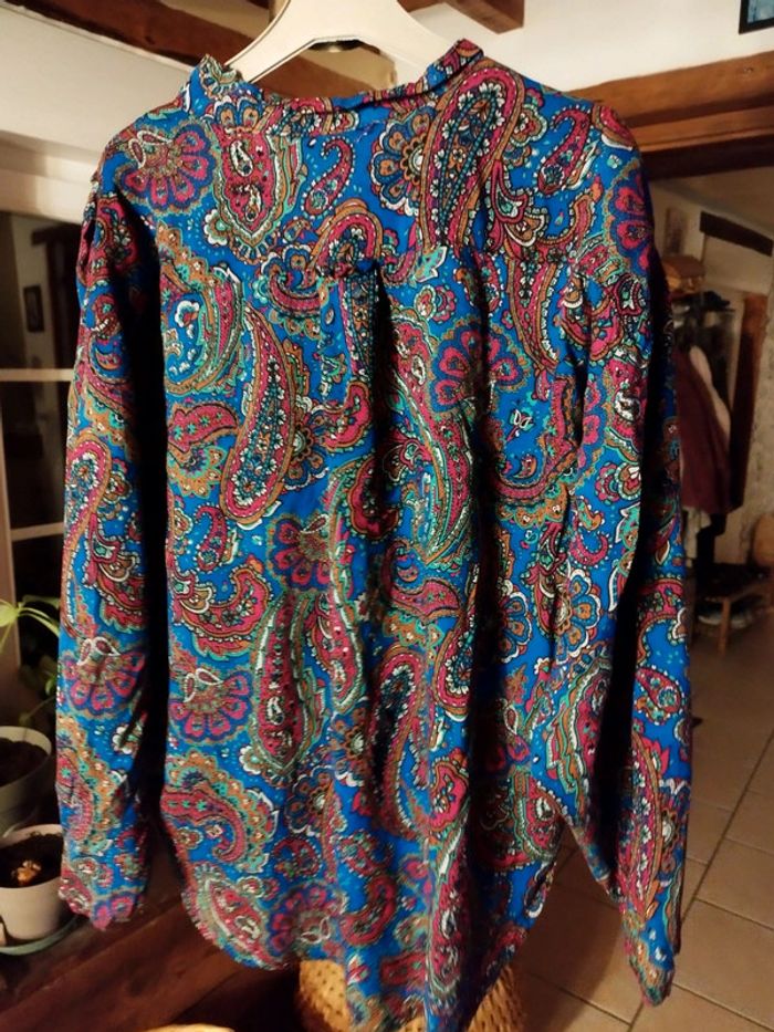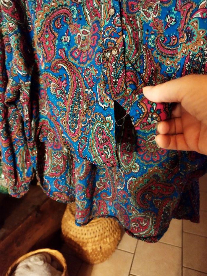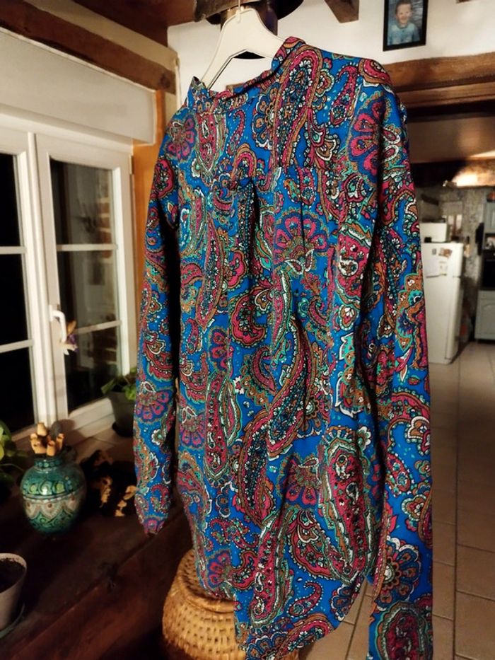 Sublime chemise motifs paisley très colorée Originale car plus courte devant que derrière 4 boutons Il y avait des épaulettes que j'ai enlevées car elles s'abimaient 100% viscose Très bon état Taille 42/44