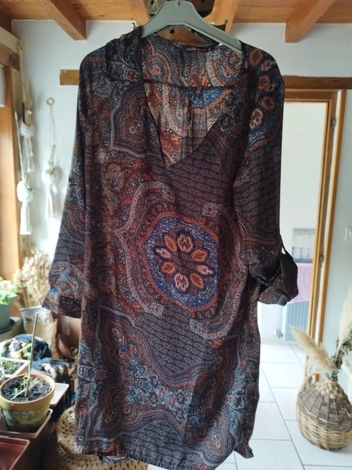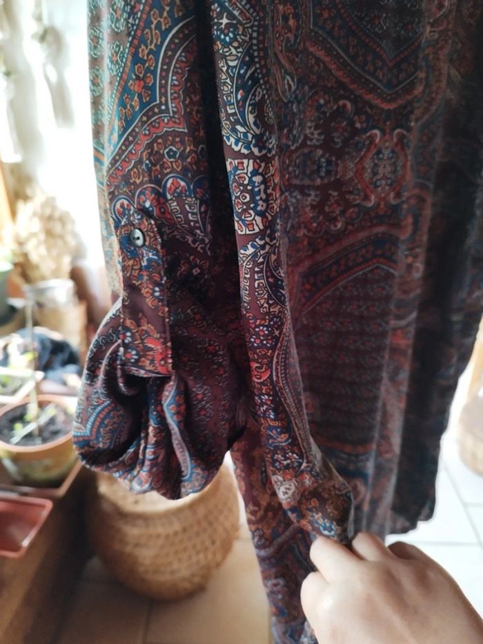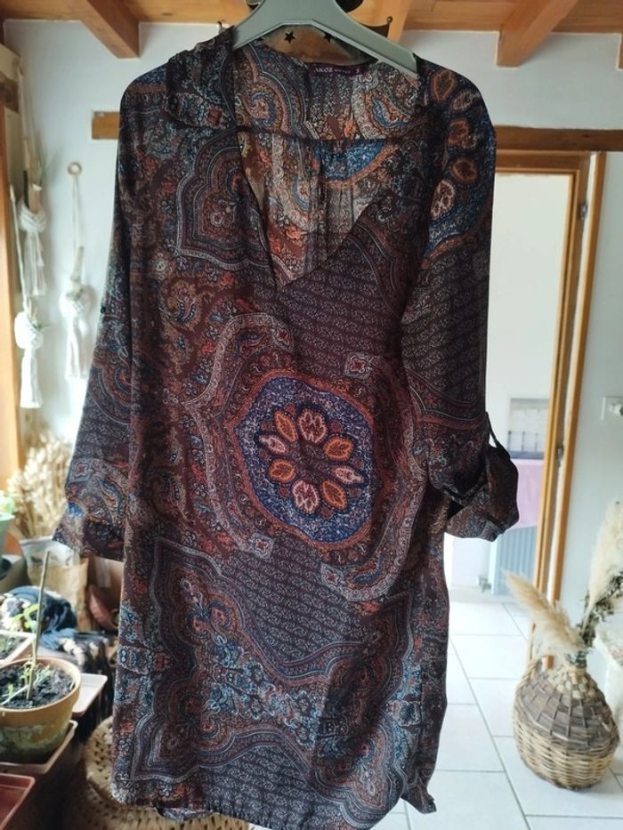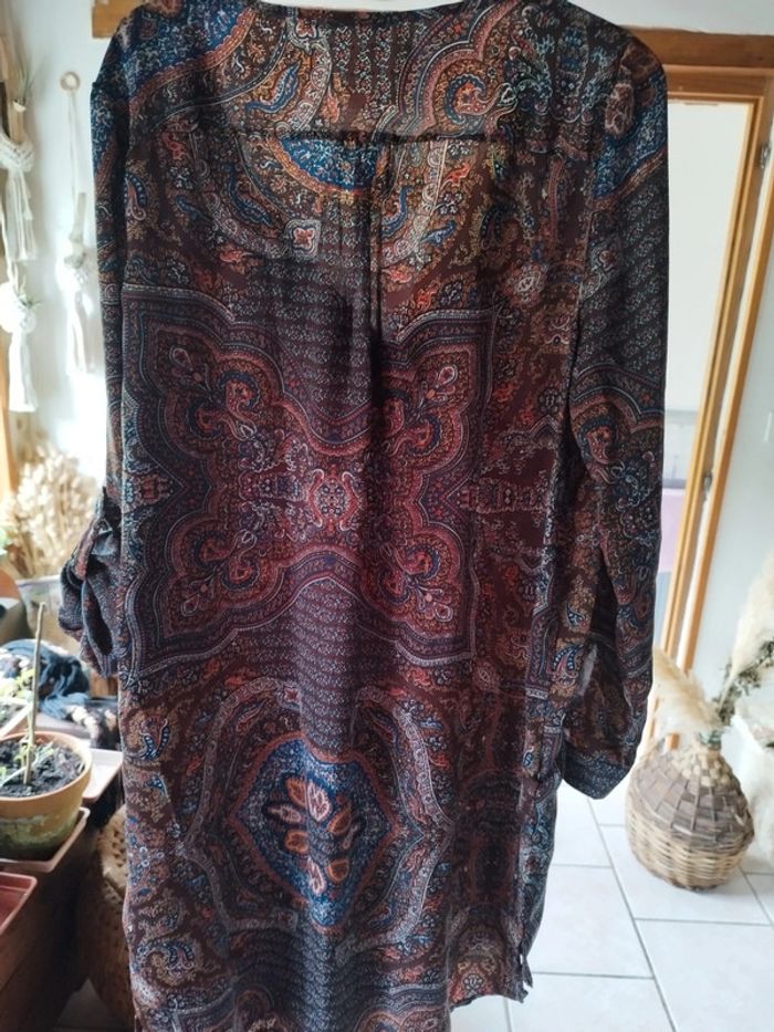 Sublime robe courte plus longue derrière que devant 100% polyester à l'aspect satiné ultra fluide et tout doux Manches longues avec bouton et cordon pour les replier Base arrondie En excellent état Taille S