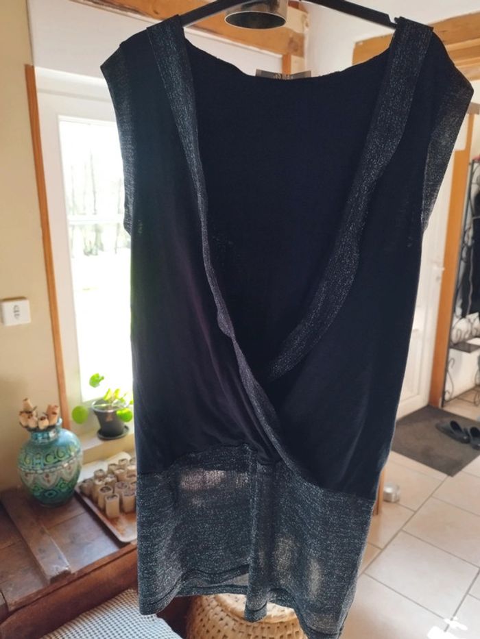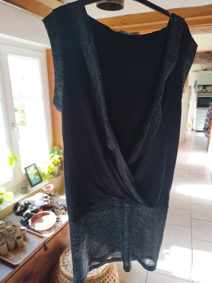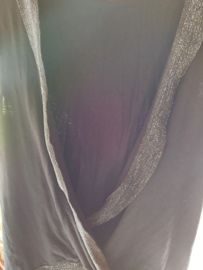 Joli top avec capuche Large bordure paillettes argent en bas + aux emmanchures + autour de la capuche+ sur le grand décolleté 93% viscose. 7% elasthane En excellent état Taille 1 convient jusqu'au 40