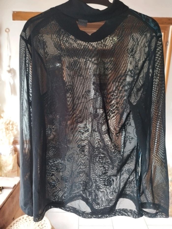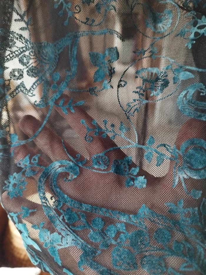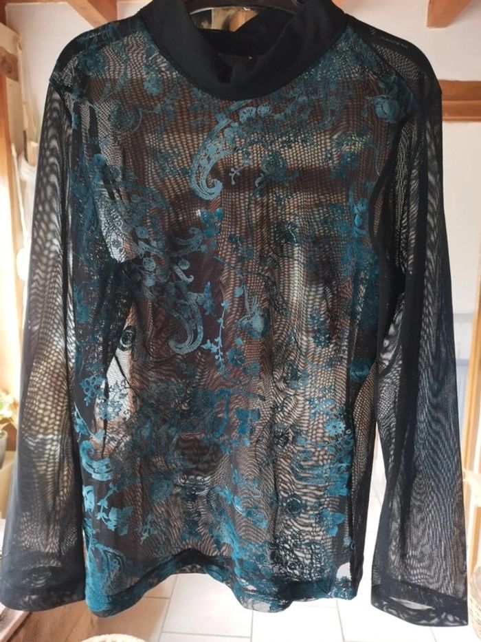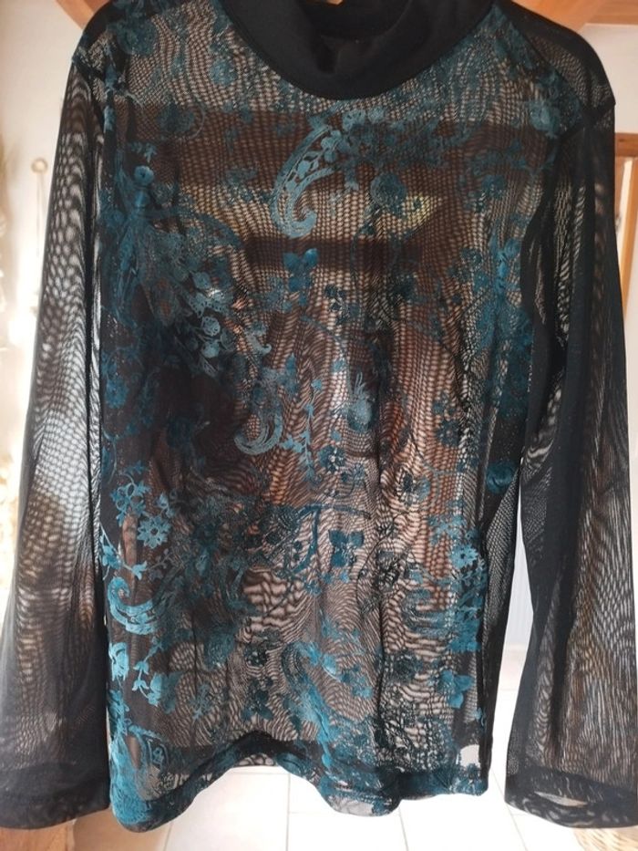 Magnifique t shirt en voile transparent avec sublimes motifs fleurs vert/bleu devant puis manches et dos unis noir En excellent état Taille unique, vérifiez vos mesures Épaules : 40cm Aisselles : 48cm