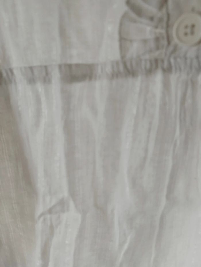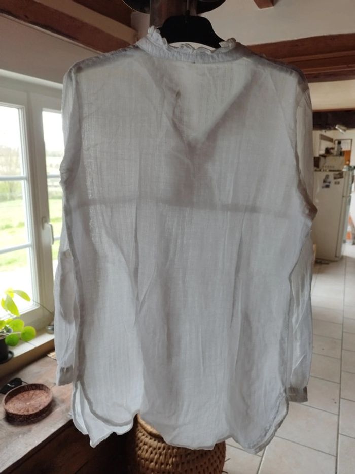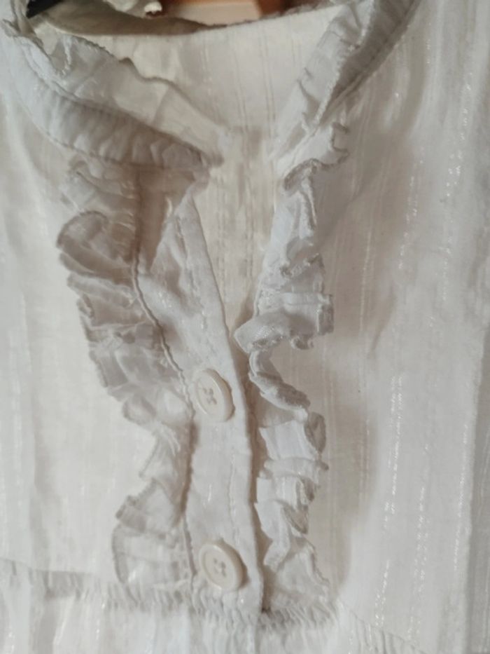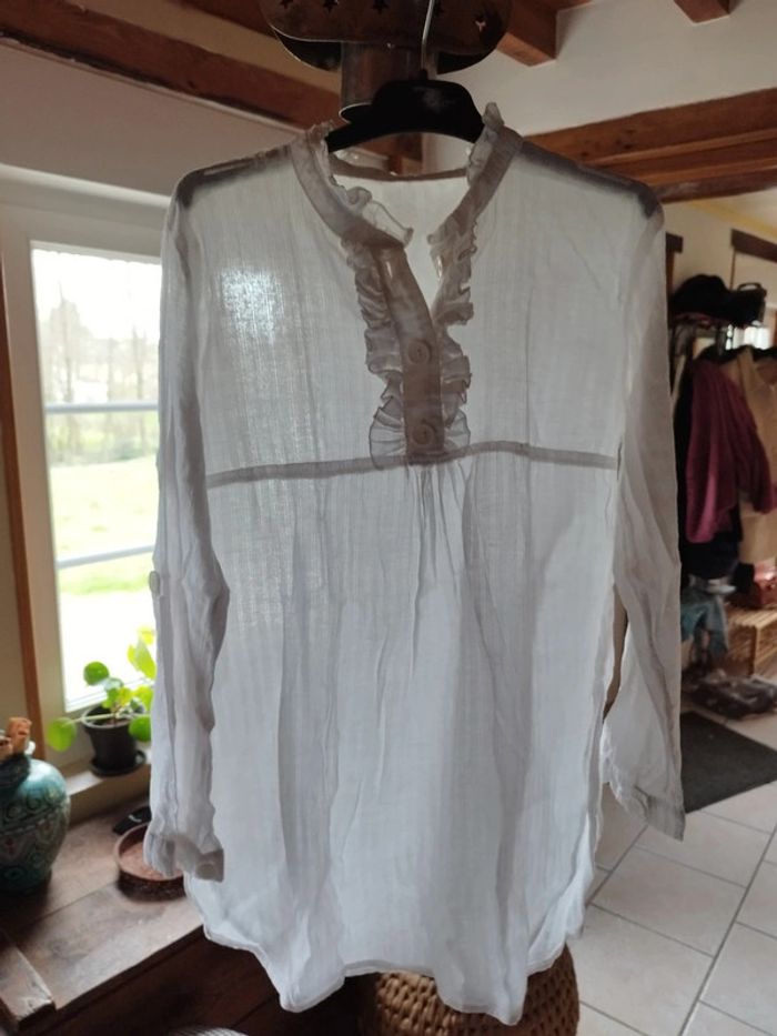 Sublime blouse blanche avec fines lignes argentées Idéale pour un look bohème Manches longues qui peuvent se replier (boutons pour maintenir) Col froufrou avec 3 boutons Fentes de chaque côté 100% coton En excellent état Taille S