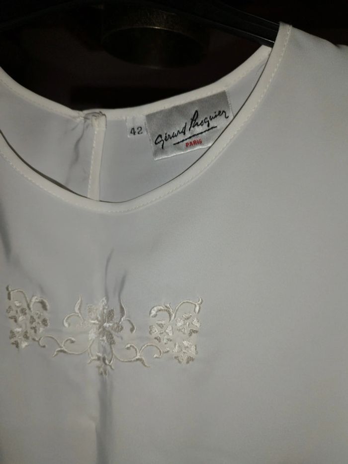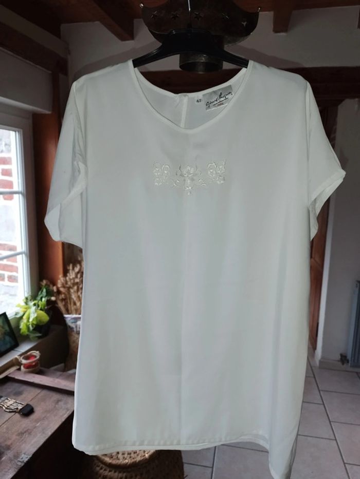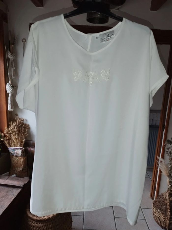 Magnifique petit haut ultra fluide 100% polyester au toucher doux et satiné Jolie broderie fleurs Ouverture et un bouton derrière En excellent état Taille 42