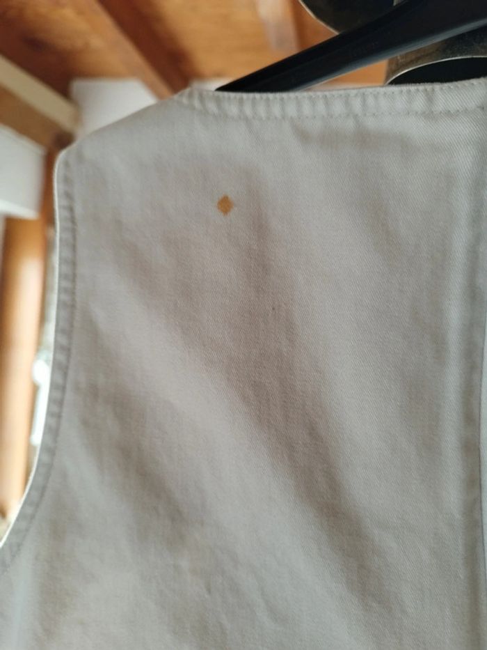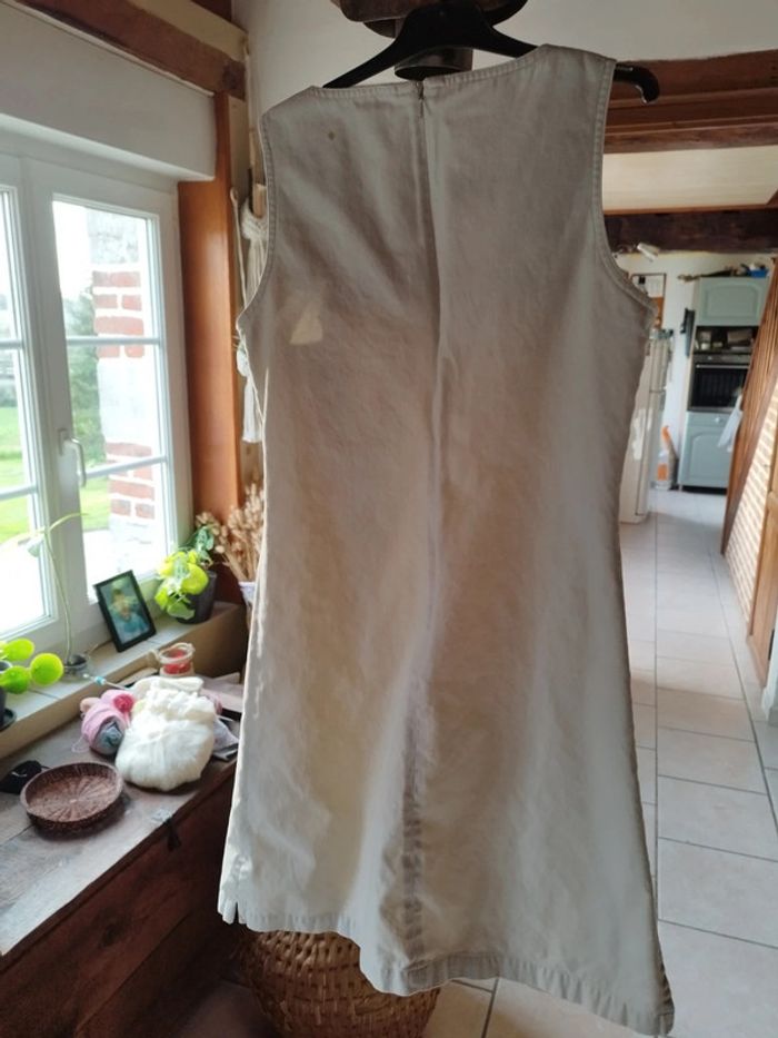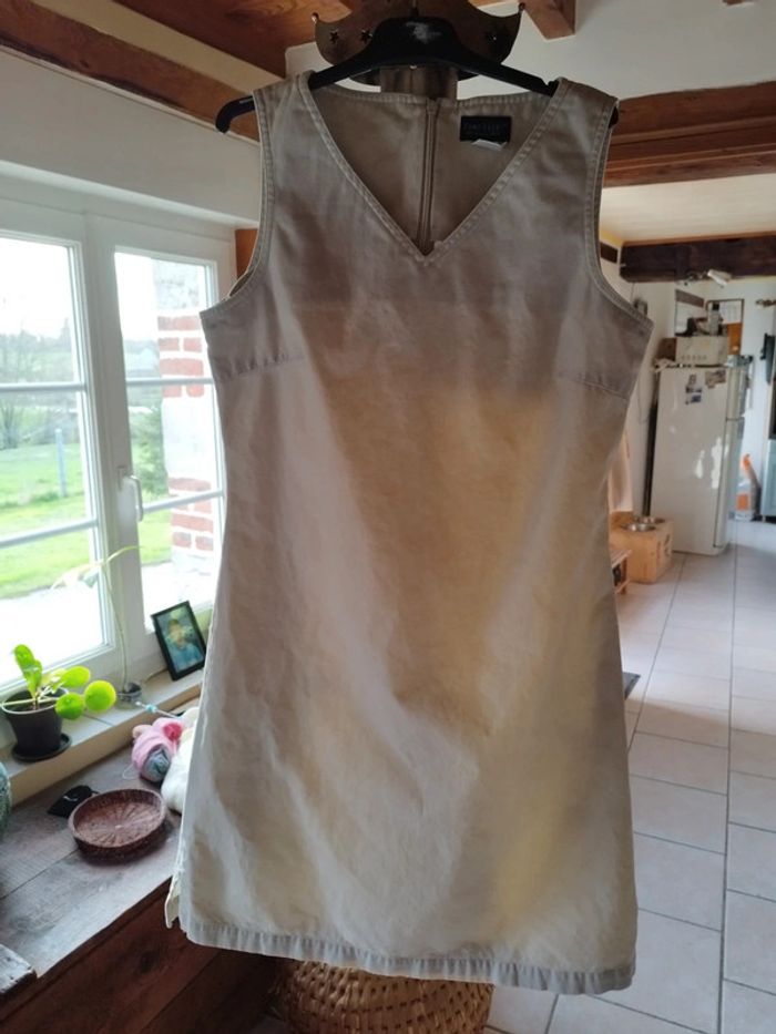 Simple mais efficace et féminine Col V Coupe près du corps Glissière au dos Petites fentes en bas de chaque côté 100% coton Longueur 89cm Très bon état général mais une petite tâche derrière (dernière photo) Taille 40