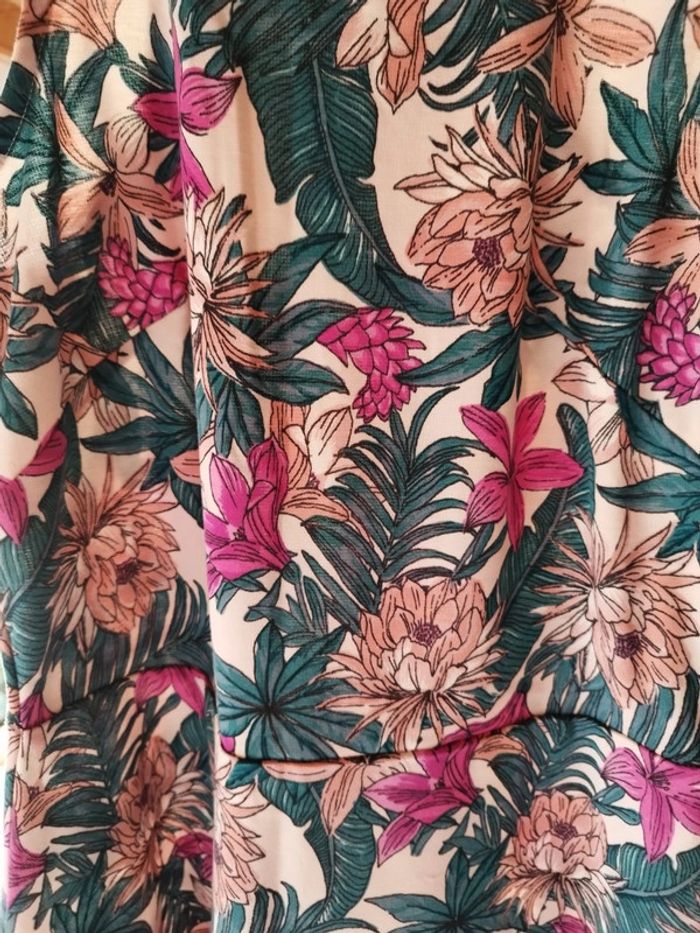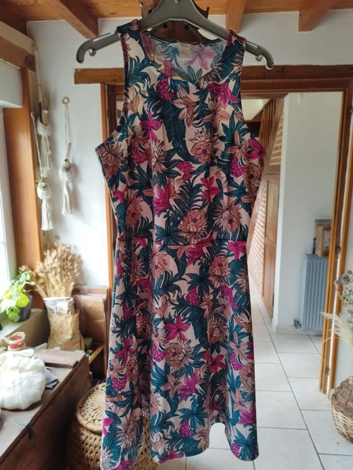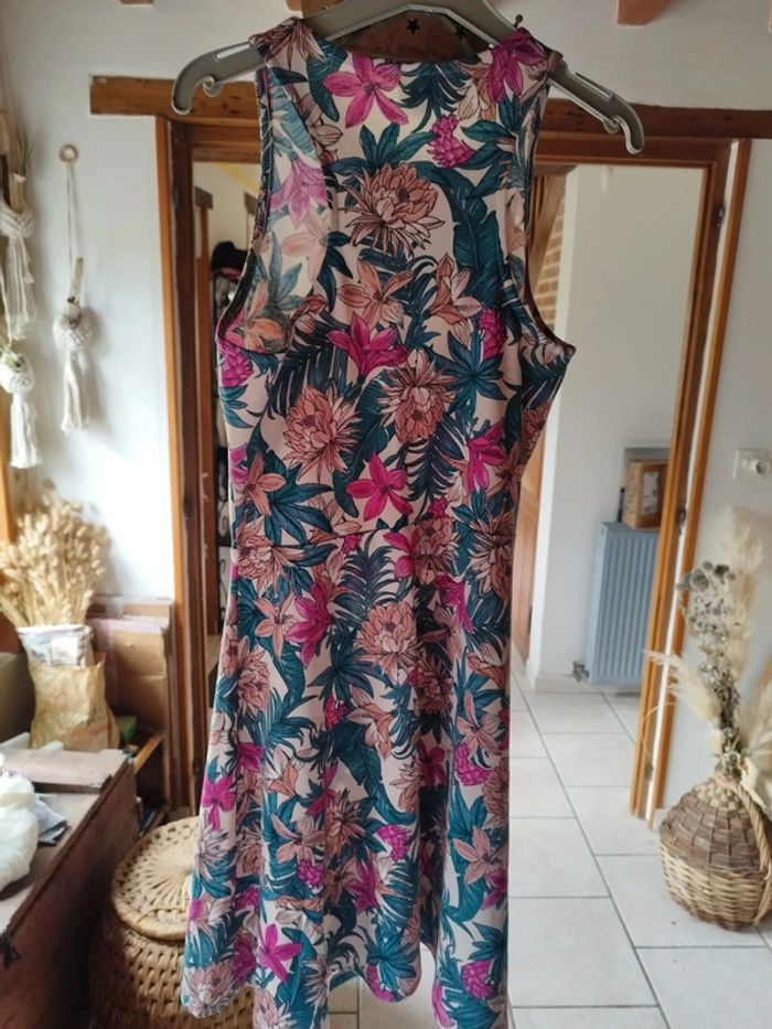 Jolie petite robe motifs fleurs multicolores Épaules dénudées Coupe légèrement évasée à partir de la taille Coton et polyester Très bon état Taille M