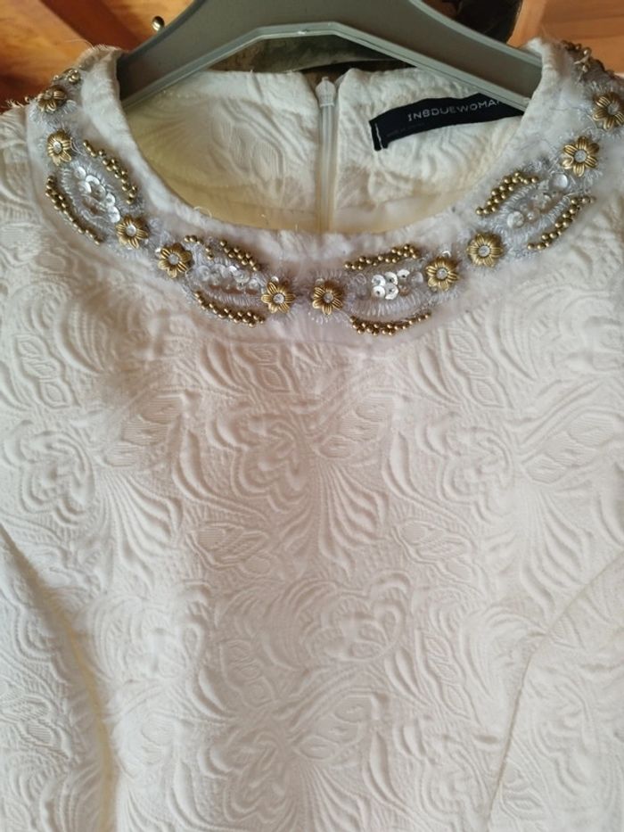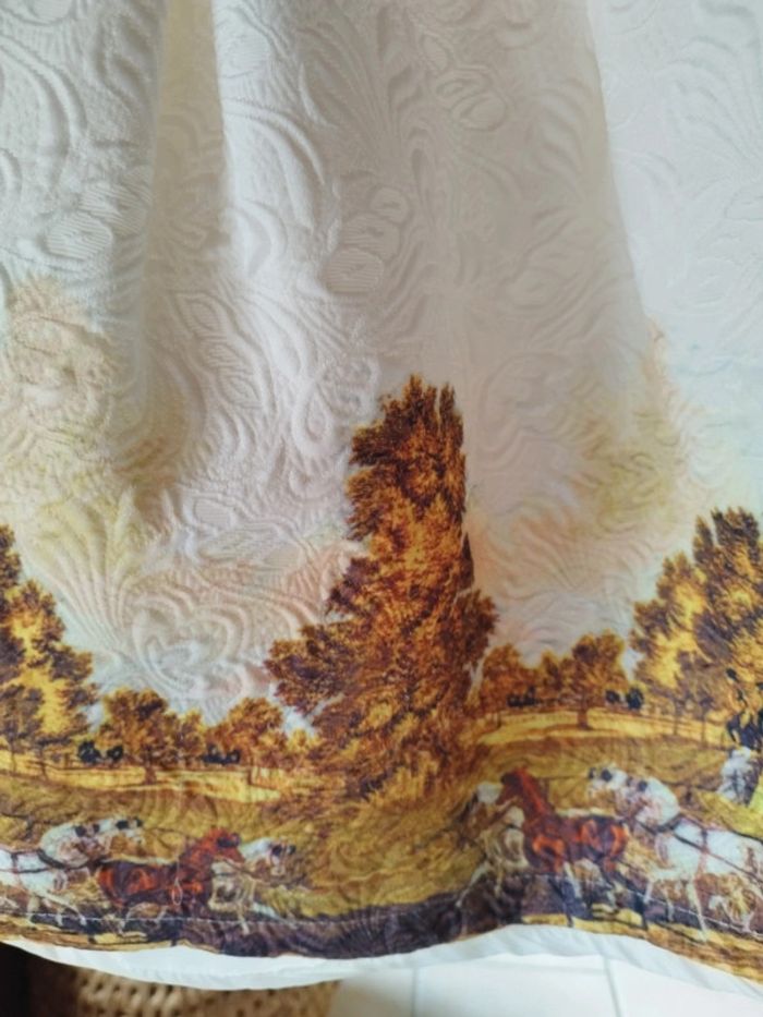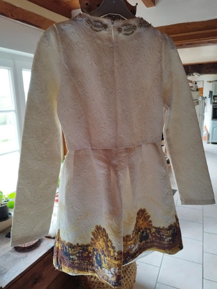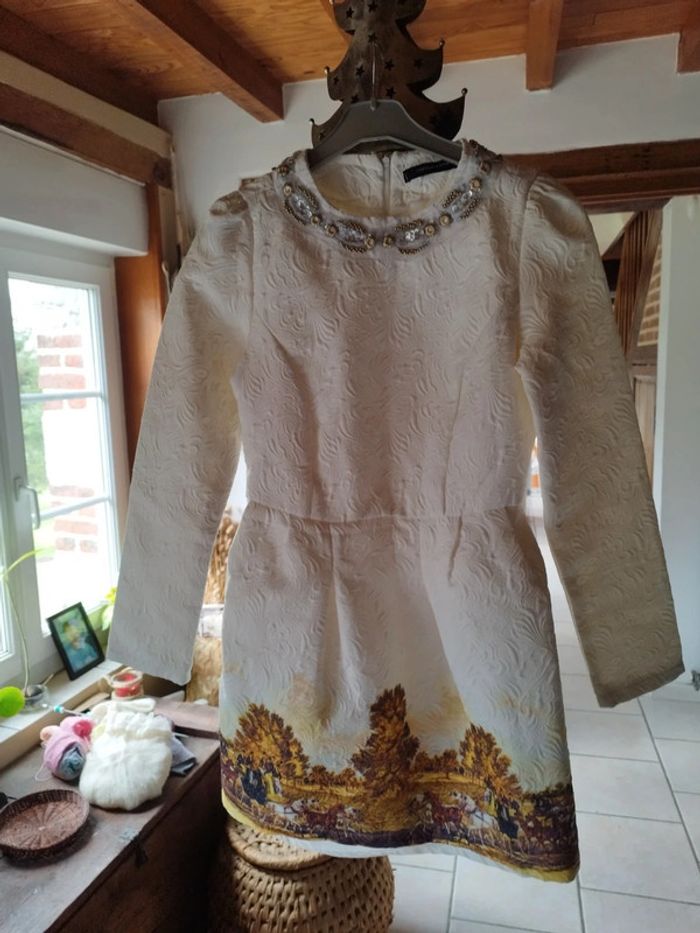 Sublime robe vintage avec de magnifiques motifs paysage ancien Cintrée à la taille puis plus évasée ensuite Perles et sequins autour de l'encolure Longue glissière au dos Manches longues Entièrement doublée Sublime tissu gaufré 100% coton Très bon état Taille S